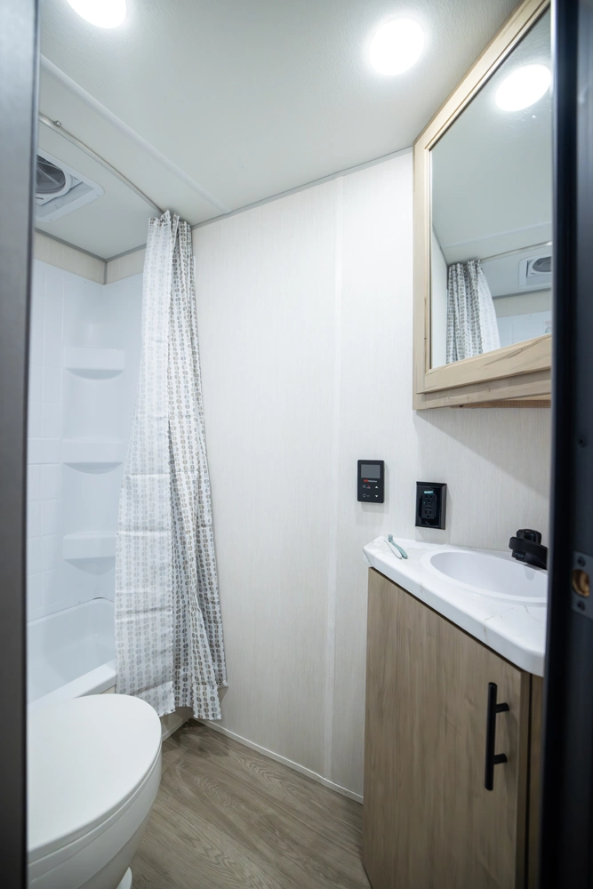 Check out one of the most lightweight, compact, and capable bunkhouse travel trailers. The 17LS can fit many people in a small amount of space and still feel comfortable and spacious. How, you ask? A queen bed with overhead cabinets makes life simple and easy for those in the primary sleeping area. In the rear bunk spot, you’ve got double-over-double bunk beds with a combined weight rating of 1.200 pounds. The bunks also feature underneath storage.