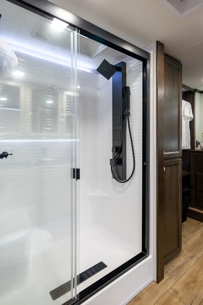 • Redesigned 48" x 30" Rectangular-Style shower with seat, sliding glass doors, and an Upgraded Shower Head