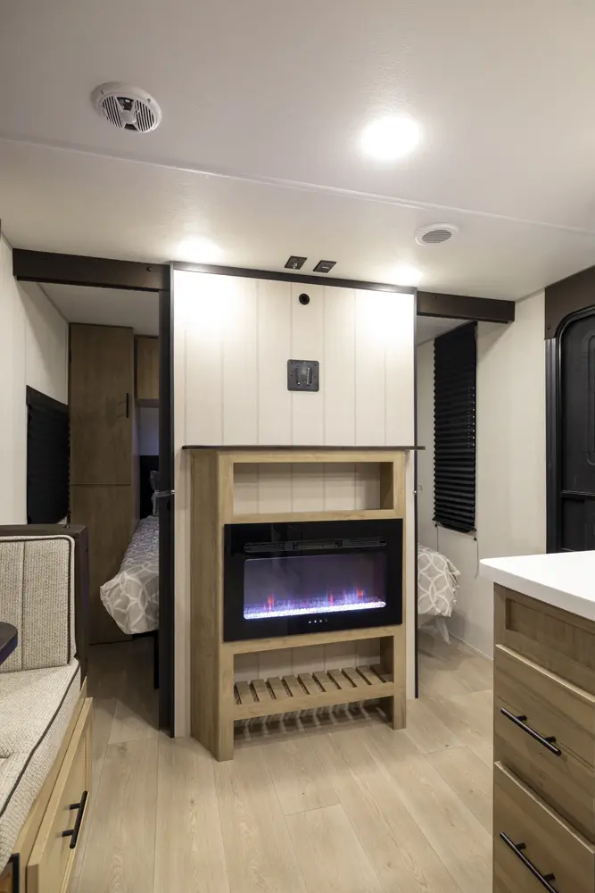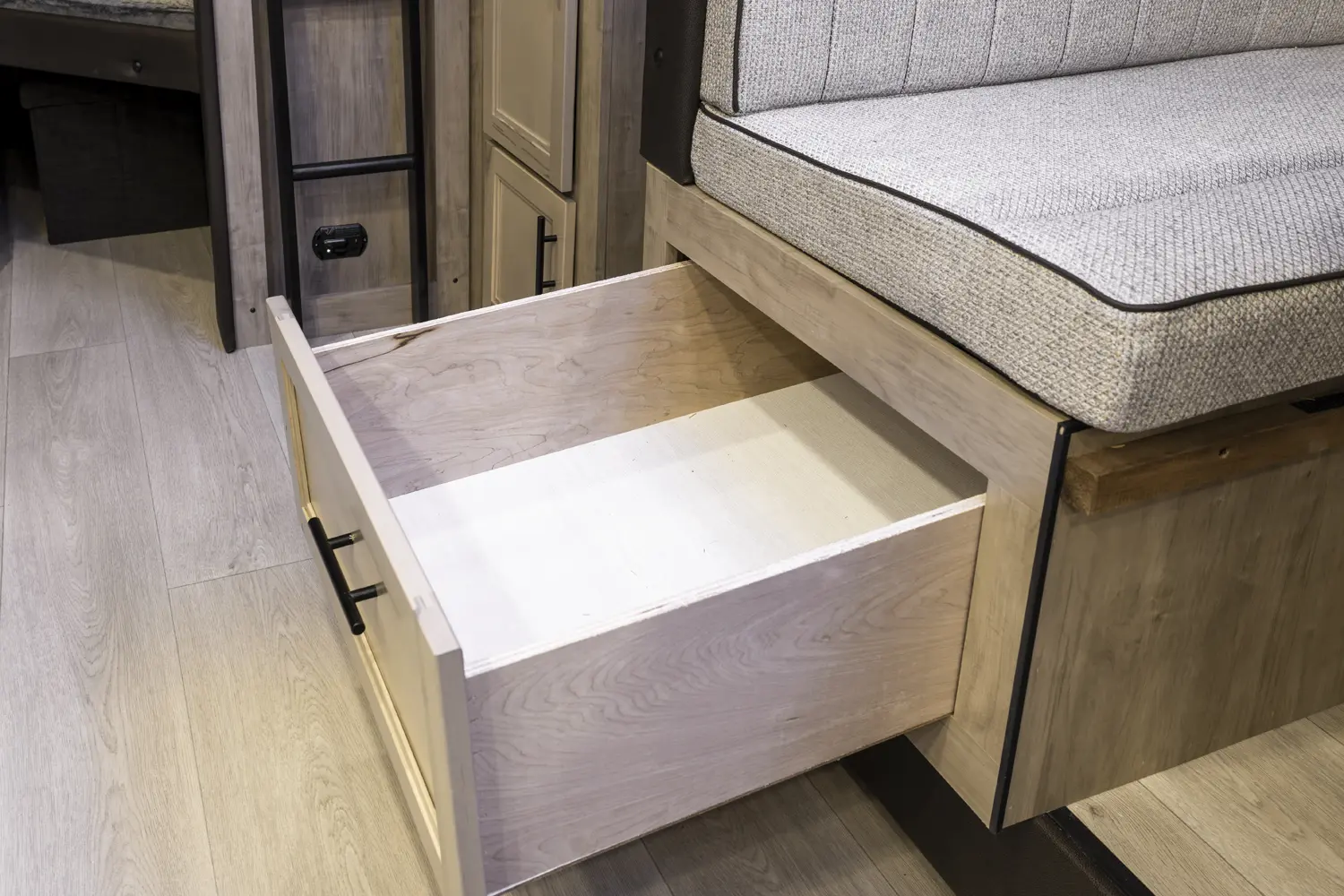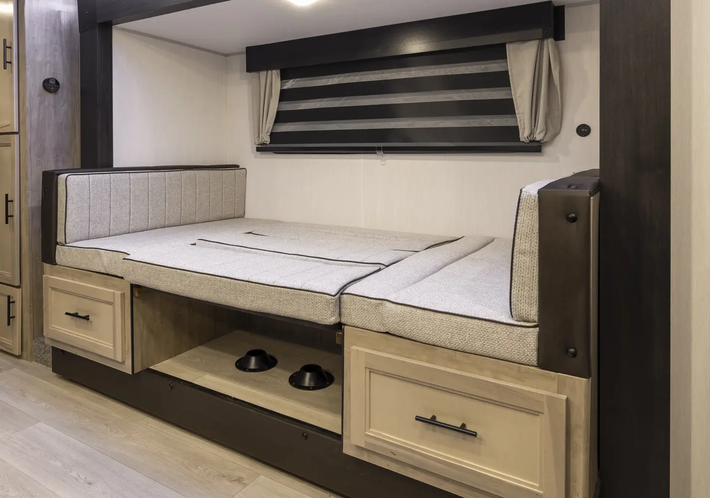 The 23DBHBL is a family bunkhouse featuring a huge double bunk with ladder for kids. The double entry doors allow easy access to the bathroom and kitchen from the exterior. The modern chef’s kitchen, oversized pantry, and extra-large U-shaped dinette with full length drawers give you more than enough storage. The private master suite provides a queen size bed with ample overhead and side cabinetry. The exterior provides under awning entertainment area with TV bracket, and outside speakers.