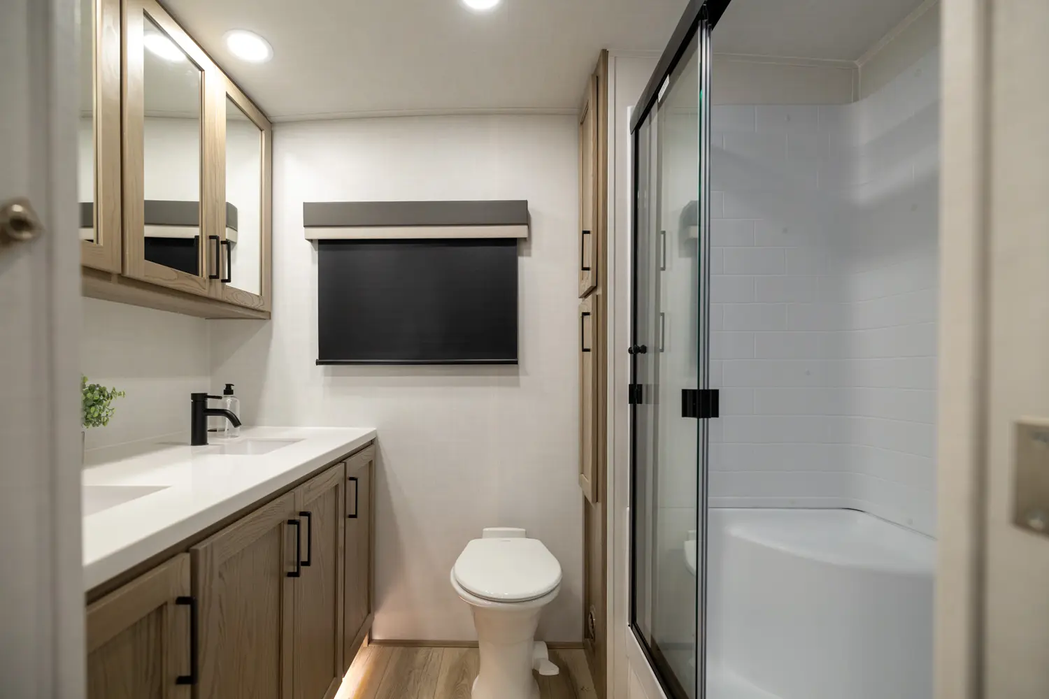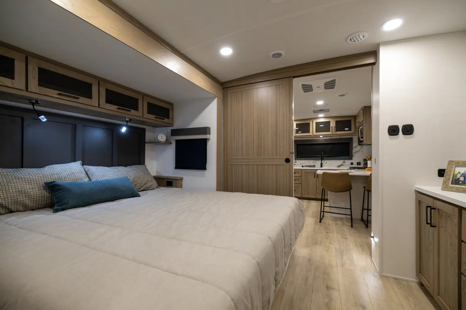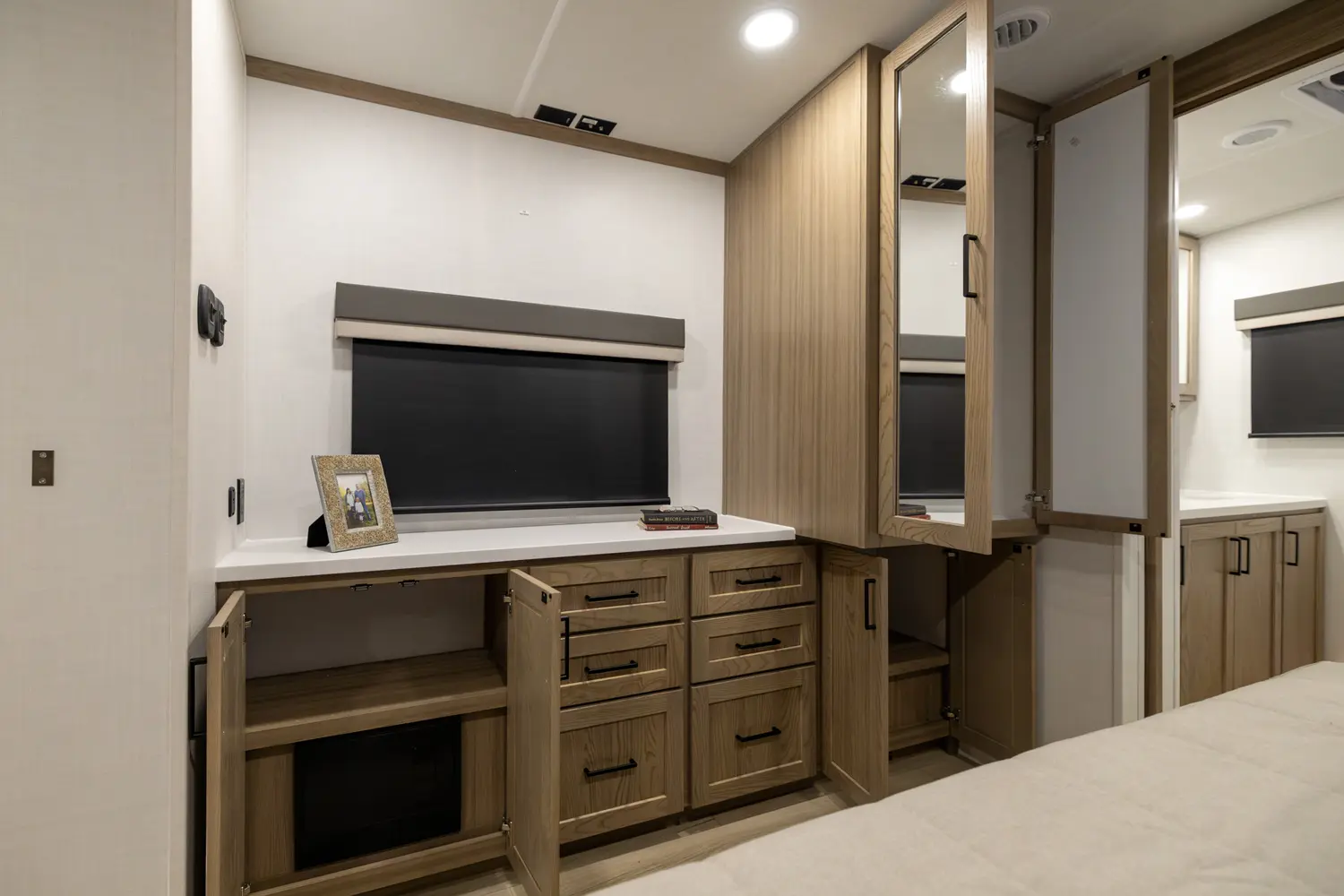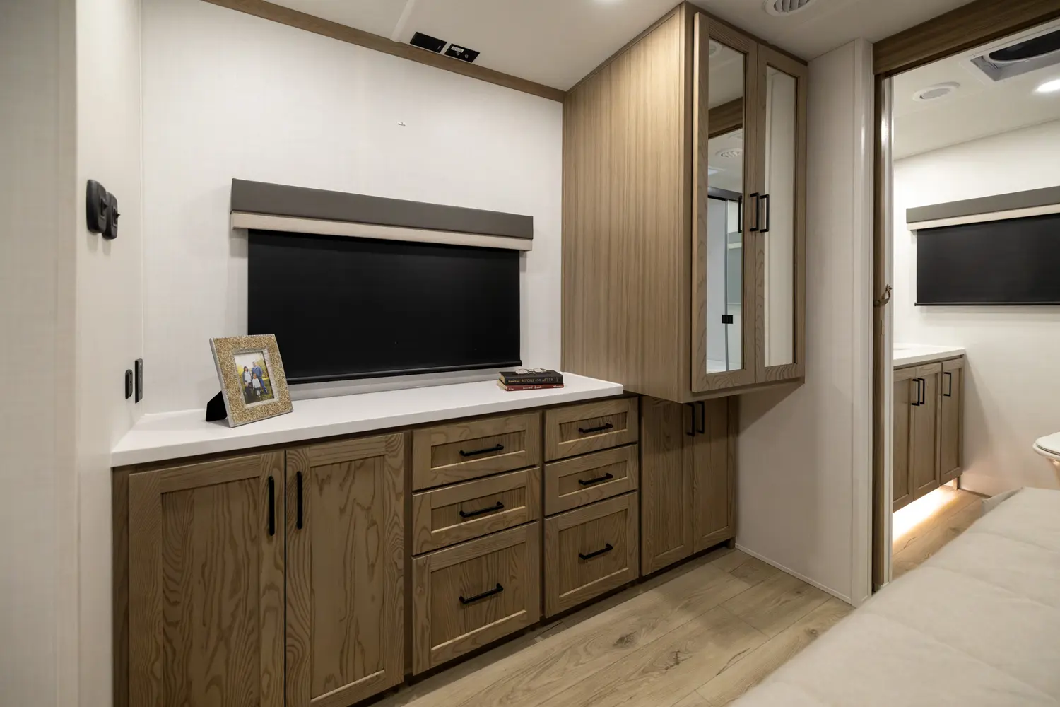 The two person bar top seating and a large window in the front give this coach an open feel with the ability to see your campsite. The theater seating is directly across the entertainment center for easy viewing and comfort. The bedroom in this unit is the game changer with a king bed in a slide out, a large wardrobe and dresser in the middle of this bedroom is perfect. A bathroom with a double sink vanity and 48” x 30” shower with a seat make this bathroom truly a master.