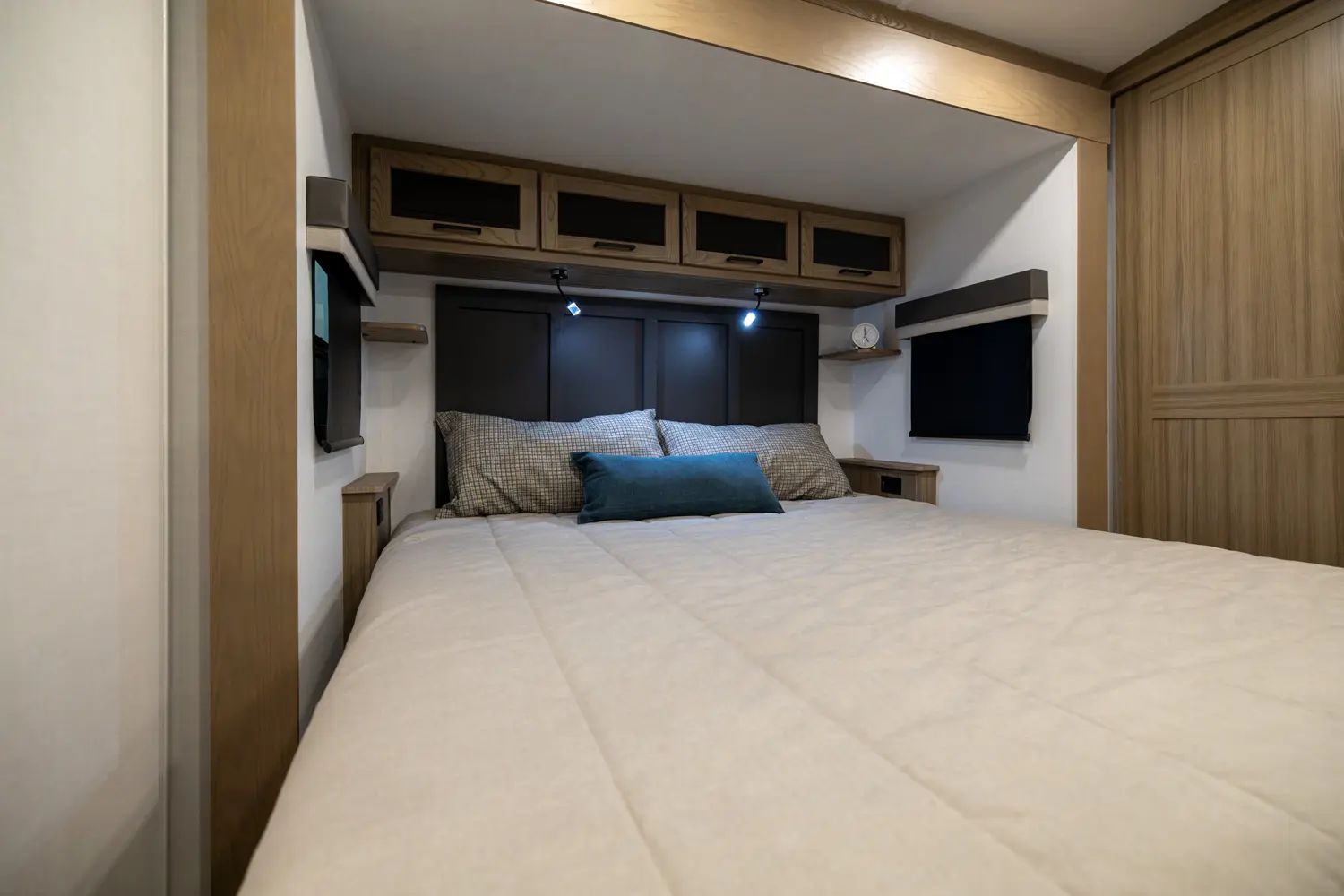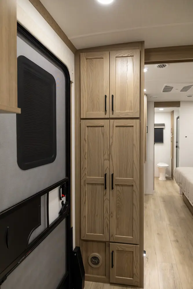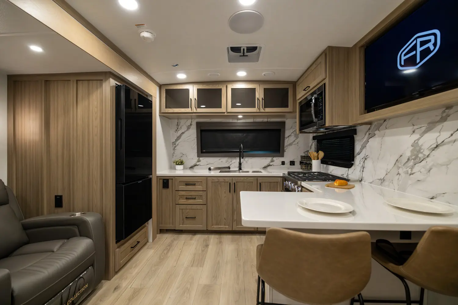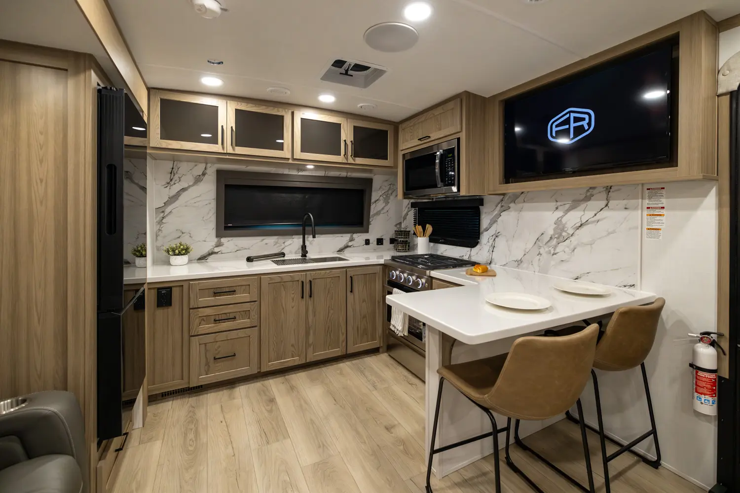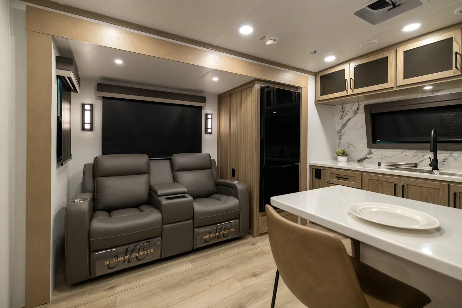 The two person bar top seating and a large window in the front give this coach an open feel with the ability to see your campsite. The theater seating is directly across the entertainment center for easy viewing and comfort. The bedroom in this unit is the game changer with a king bed in a slide out, a large wardrobe and dresser in the middle of this bedroom is perfect. A bathroom with a double sink vanity and 48” x 30” shower with a seat make this bathroom truly a master.