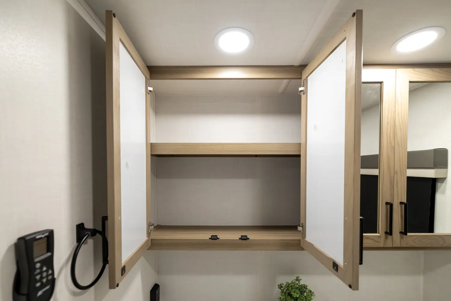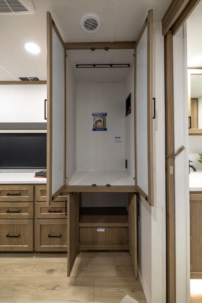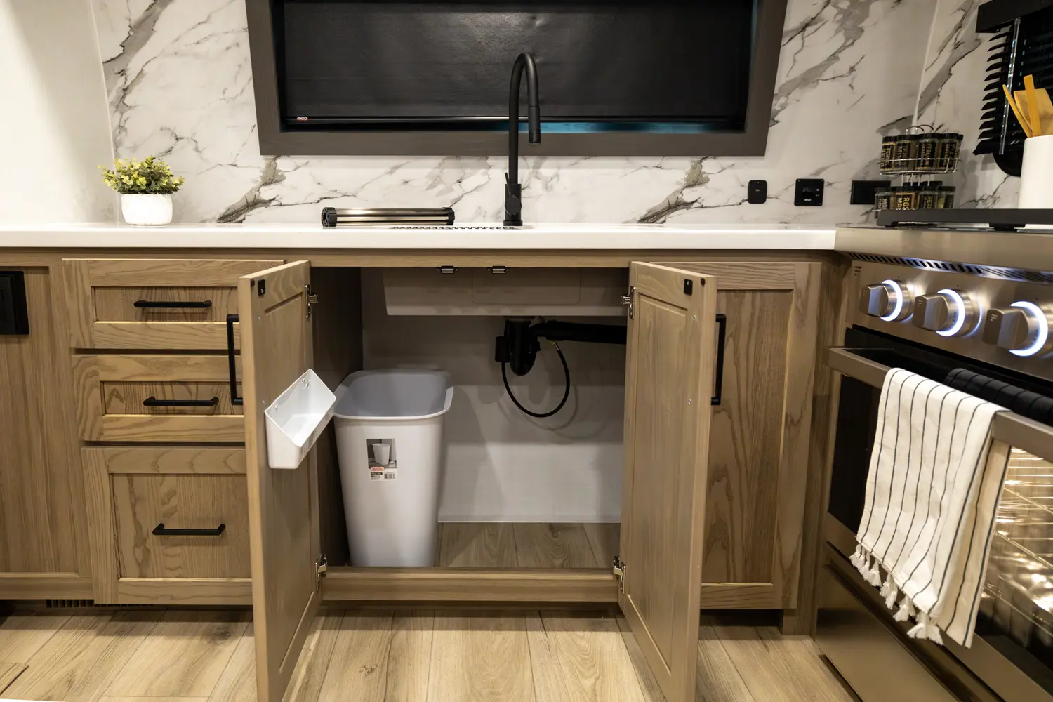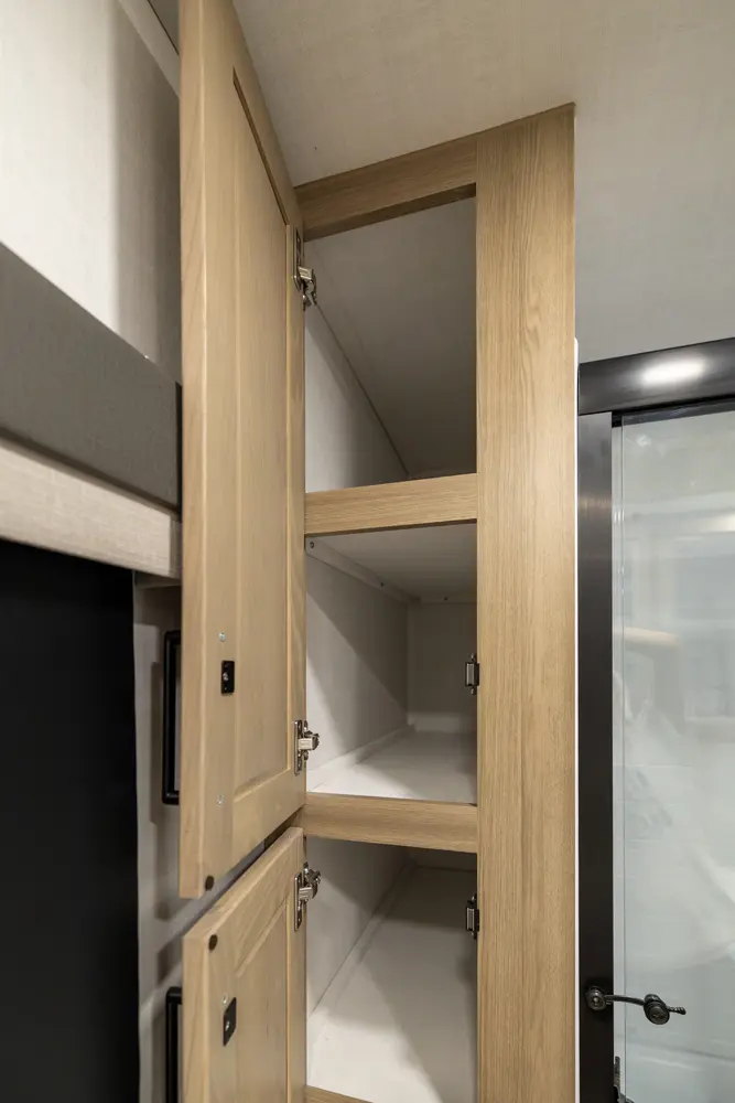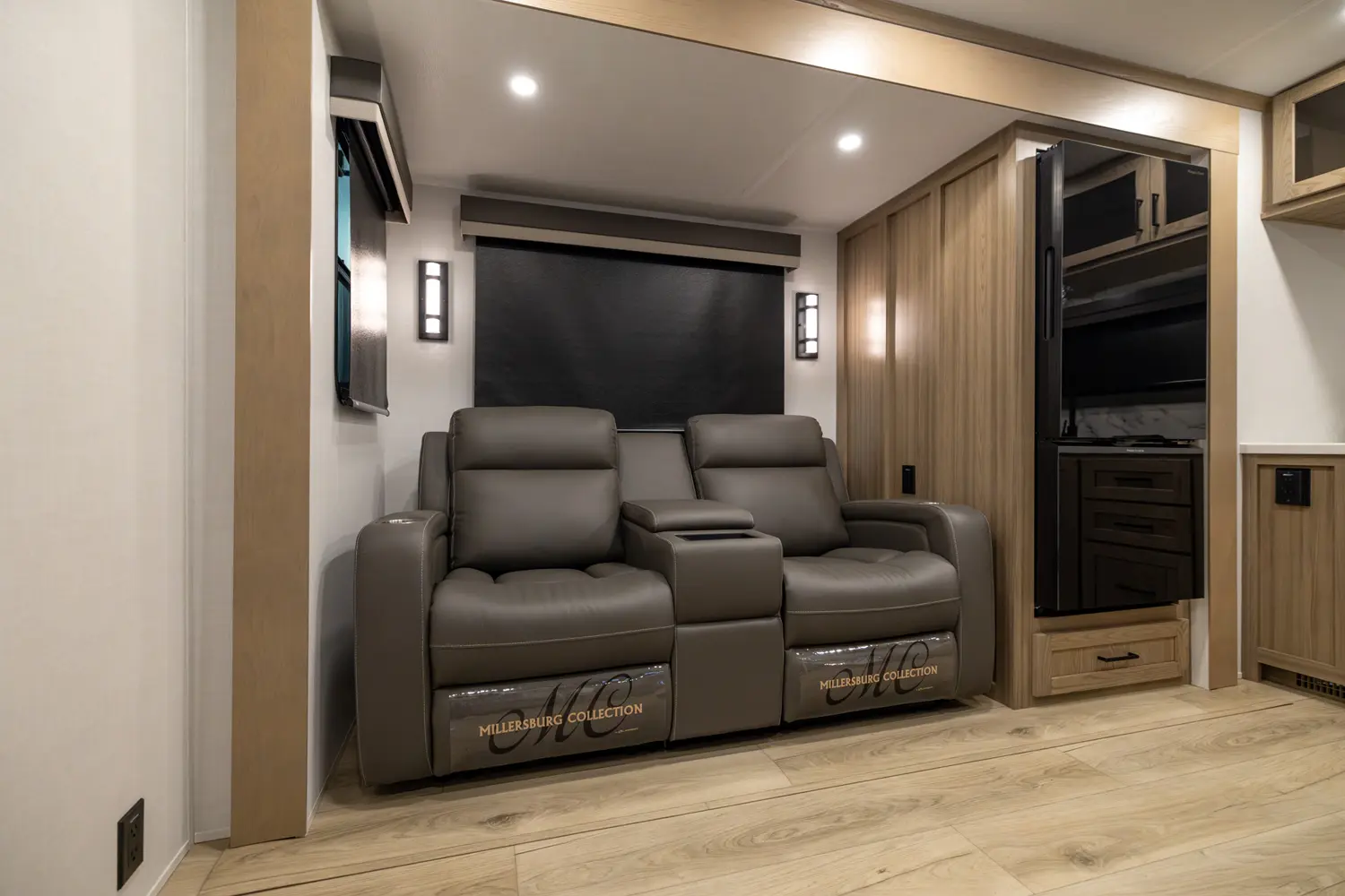 The two person bar top seating and a large window in the front give this coach an open feel with the ability to see your campsite. The theater seating is directly across the entertainment center for easy viewing and comfort. The bedroom in this unit is the game changer with a king bed in a slide out, a large wardrobe and dresser in the middle of this bedroom is perfect. A bathroom with a double sink vanity and 48” x 30” shower with a seat make this bathroom truly a master.