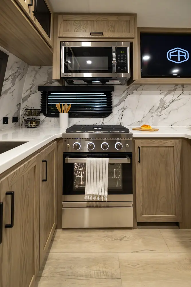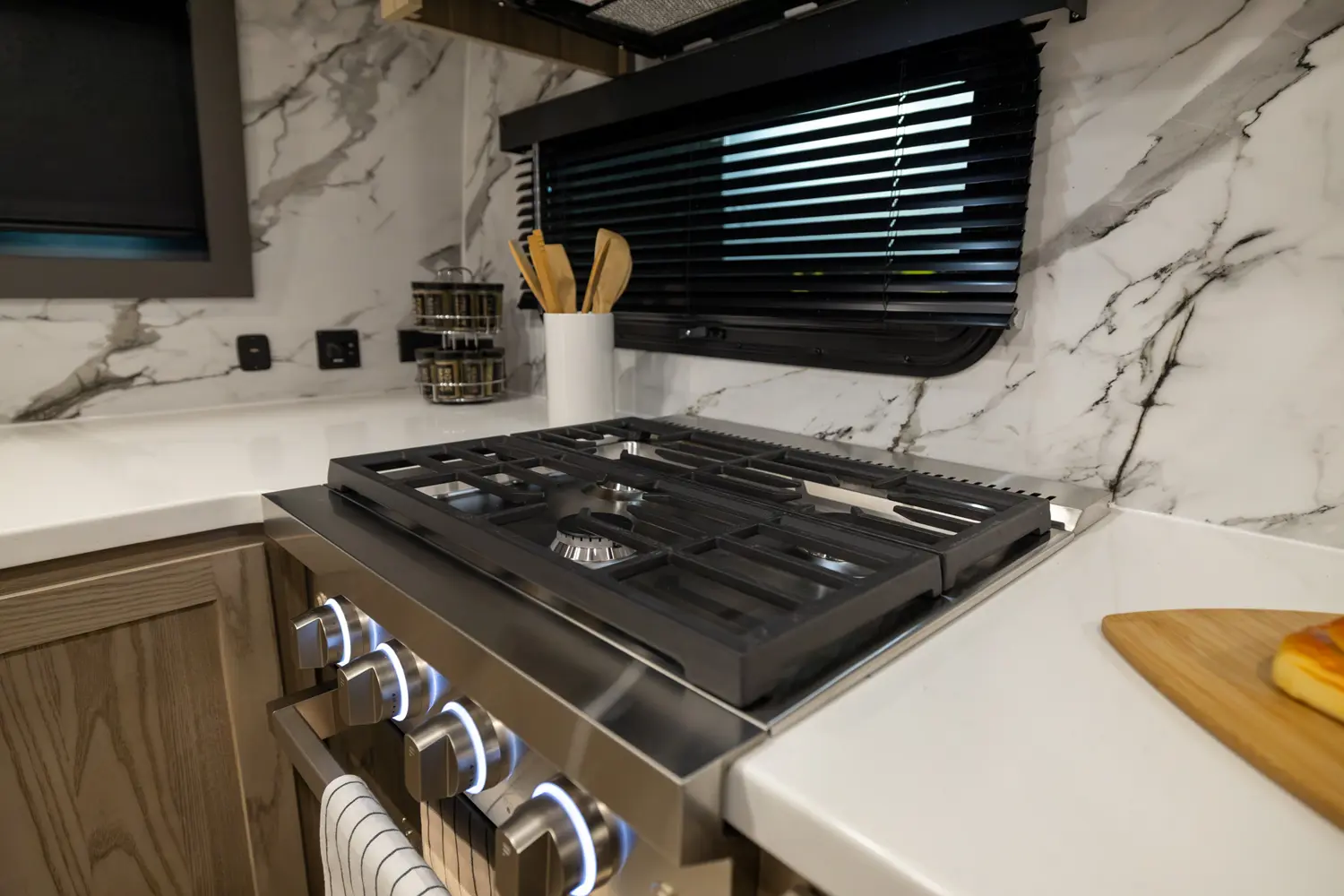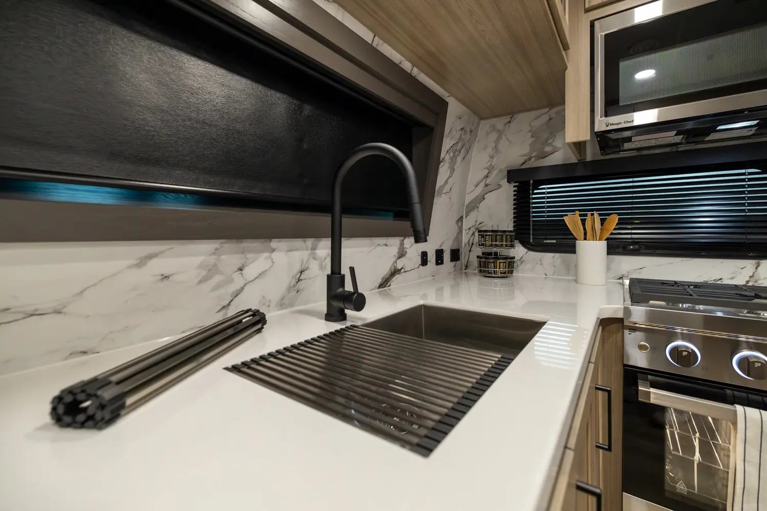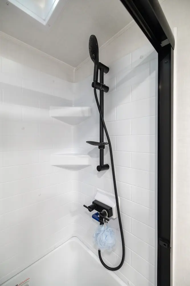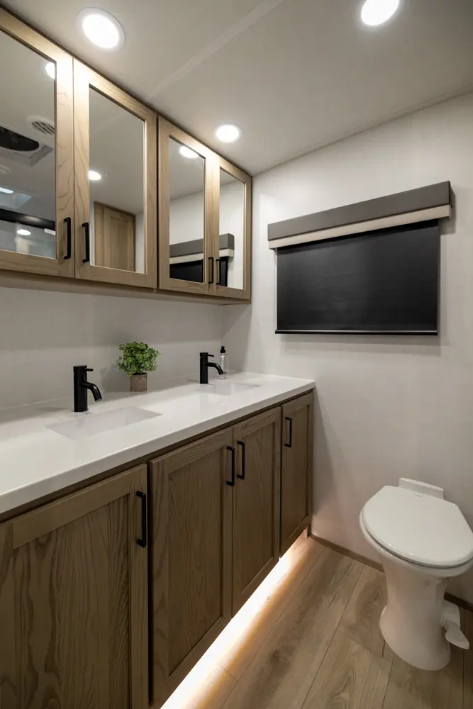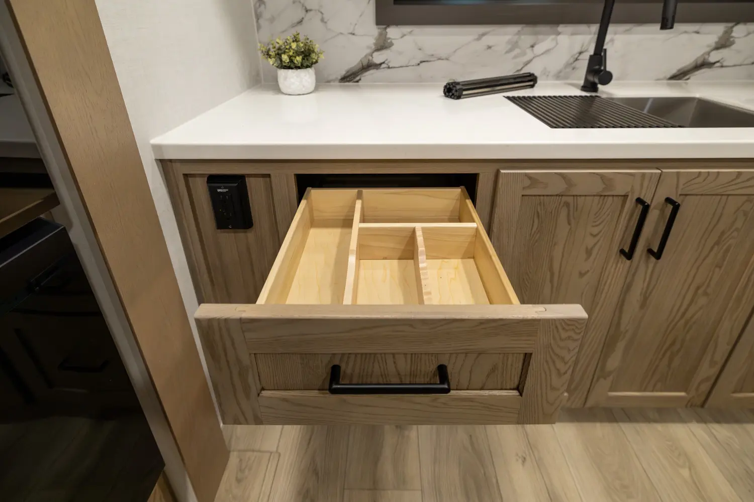 The two person bar top seating and a large window in the front give this coach an open feel with the ability to see your campsite. The theater seating is directly across the entertainment center for easy viewing and comfort. The bedroom in this unit is the game changer with a king bed in a slide out, a large wardrobe and dresser in the middle of this bedroom is perfect. A bathroom with a double sink vanity and 48” x 30” shower with a seat make this bathroom truly a master.
