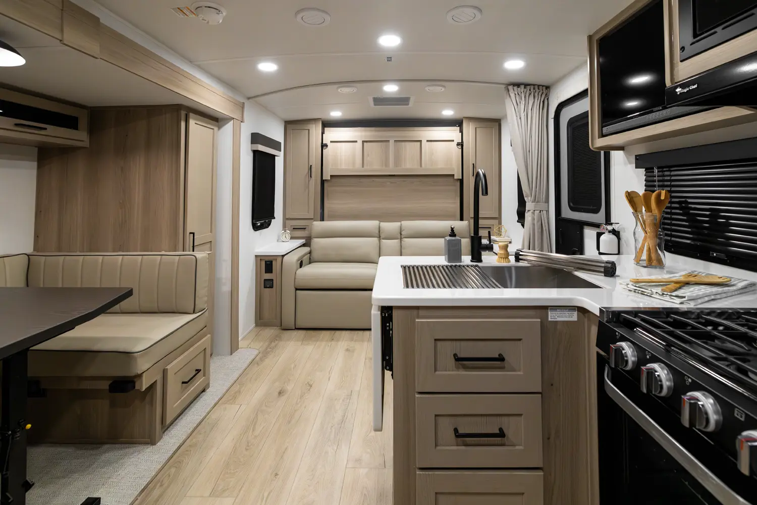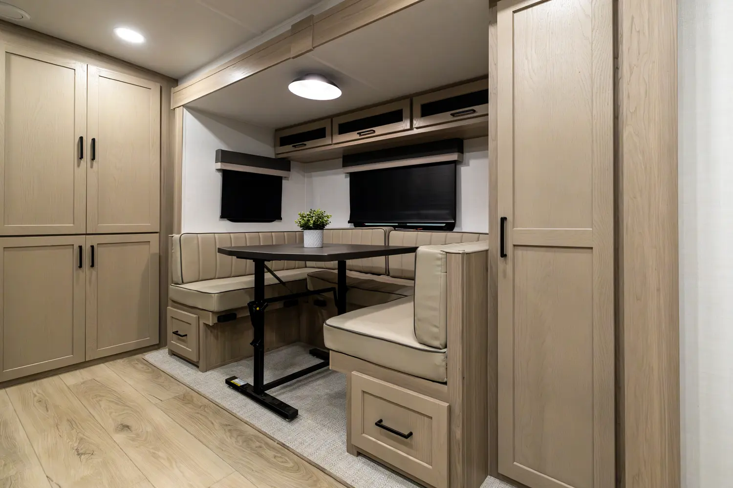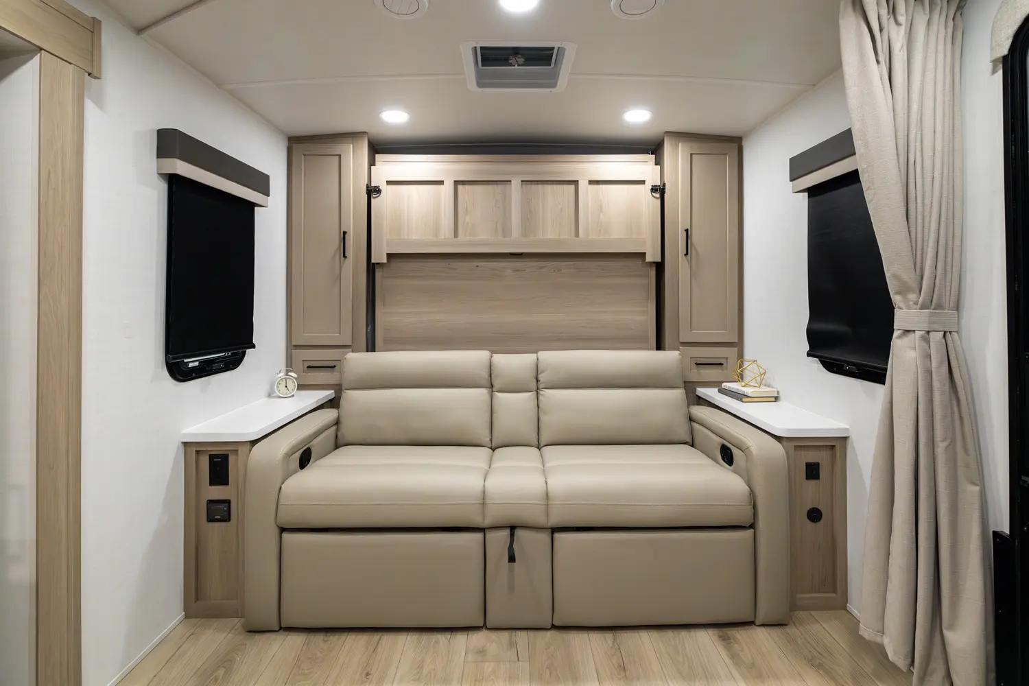 The 22SQS delivers a smart, comfortable layout with a front Murphy bed that maximizes living space by day and provides a restful sleep at night. The U-shaped dinette offers plenty of room for meals, games, or extra sleeping space when needed. A large rear bathroom with a rectangular shower adds everyday comfort and convenience making this floor plan a great choice for couples or small families who want big features in a compact trailer.