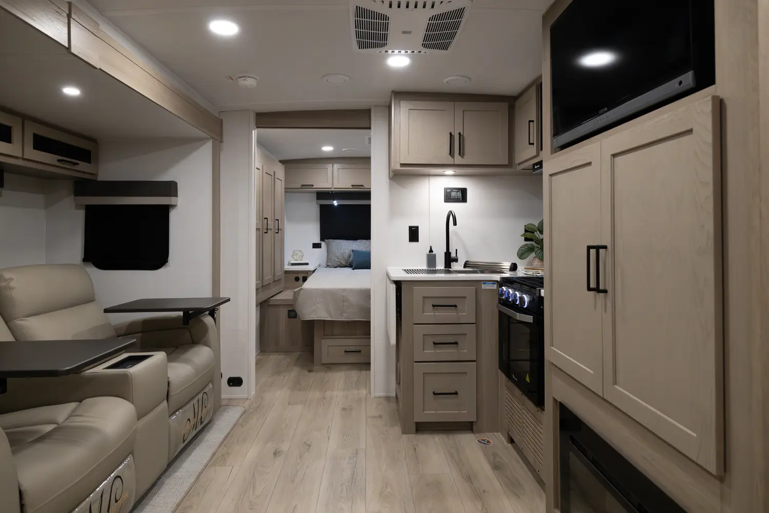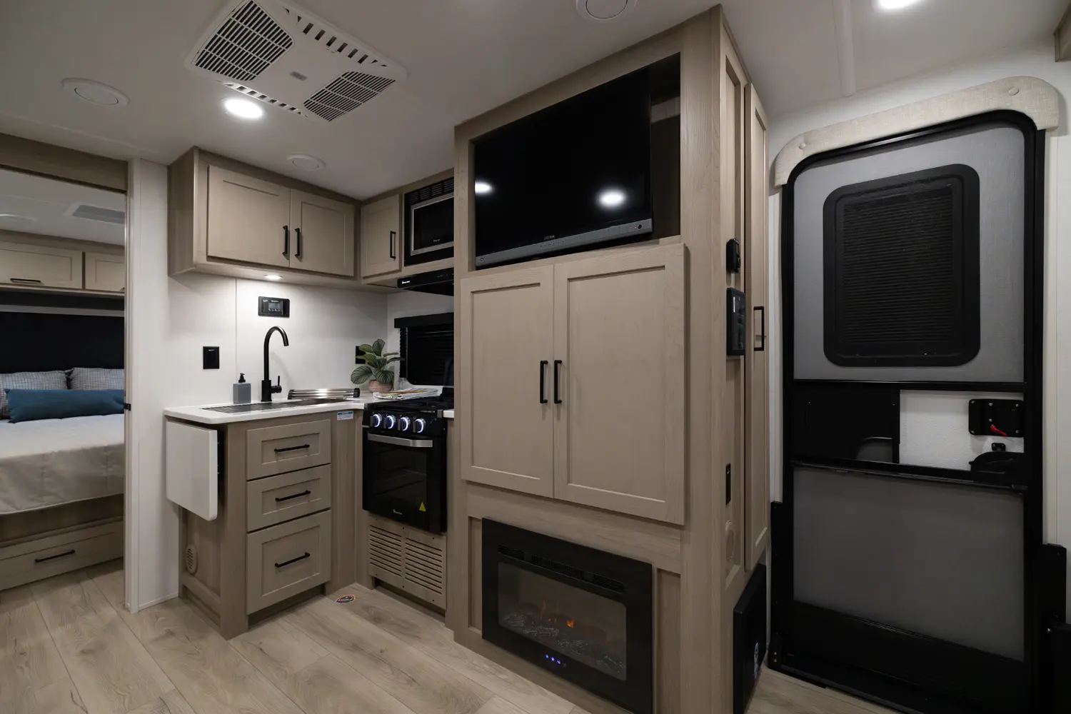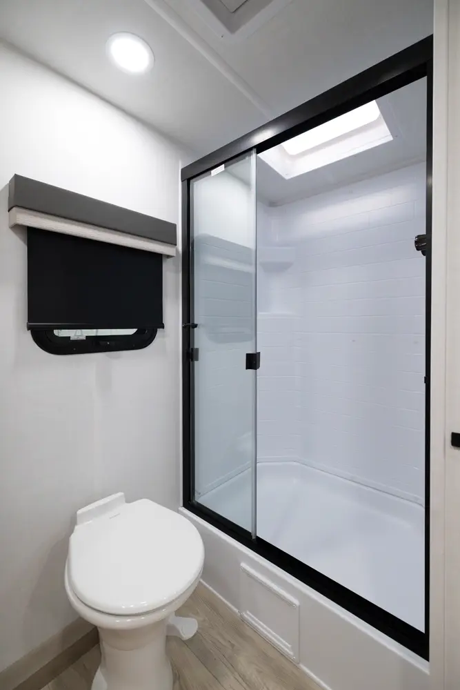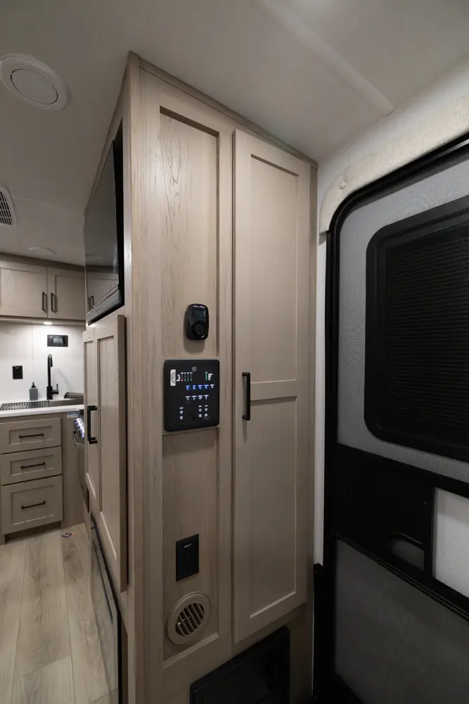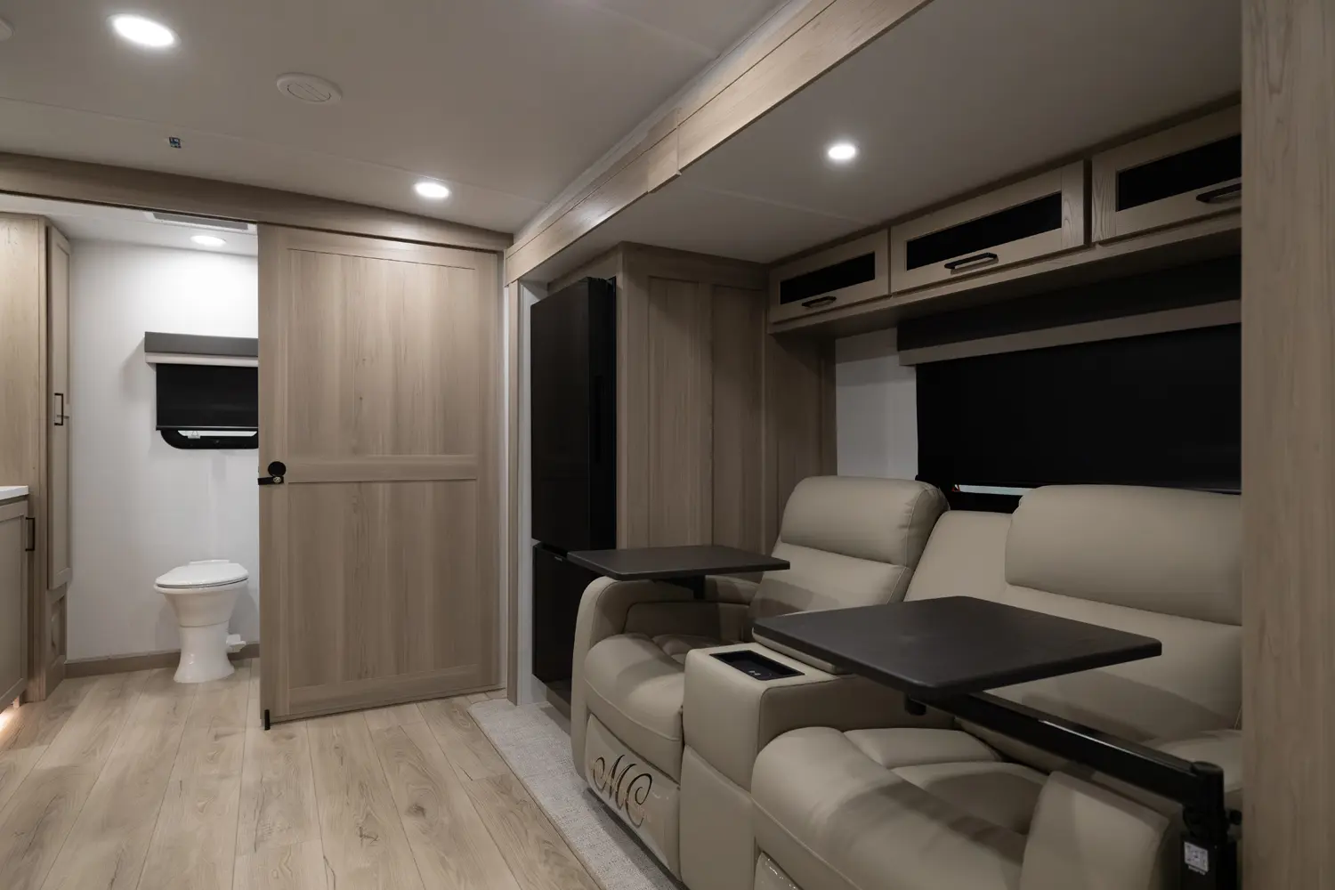 This unit is unique with its big 36" sliding doors leading to the bathroom and bedroom. These doors make moving around for a broad shouldered person easier and comfortable. The entertainment center is loaded with 32" tv, a residential-style soundbar and a fireplace space heater. Across from this lovely entertainment center is a 72" theatre seating which is perfect for reclining and watching a good movie.