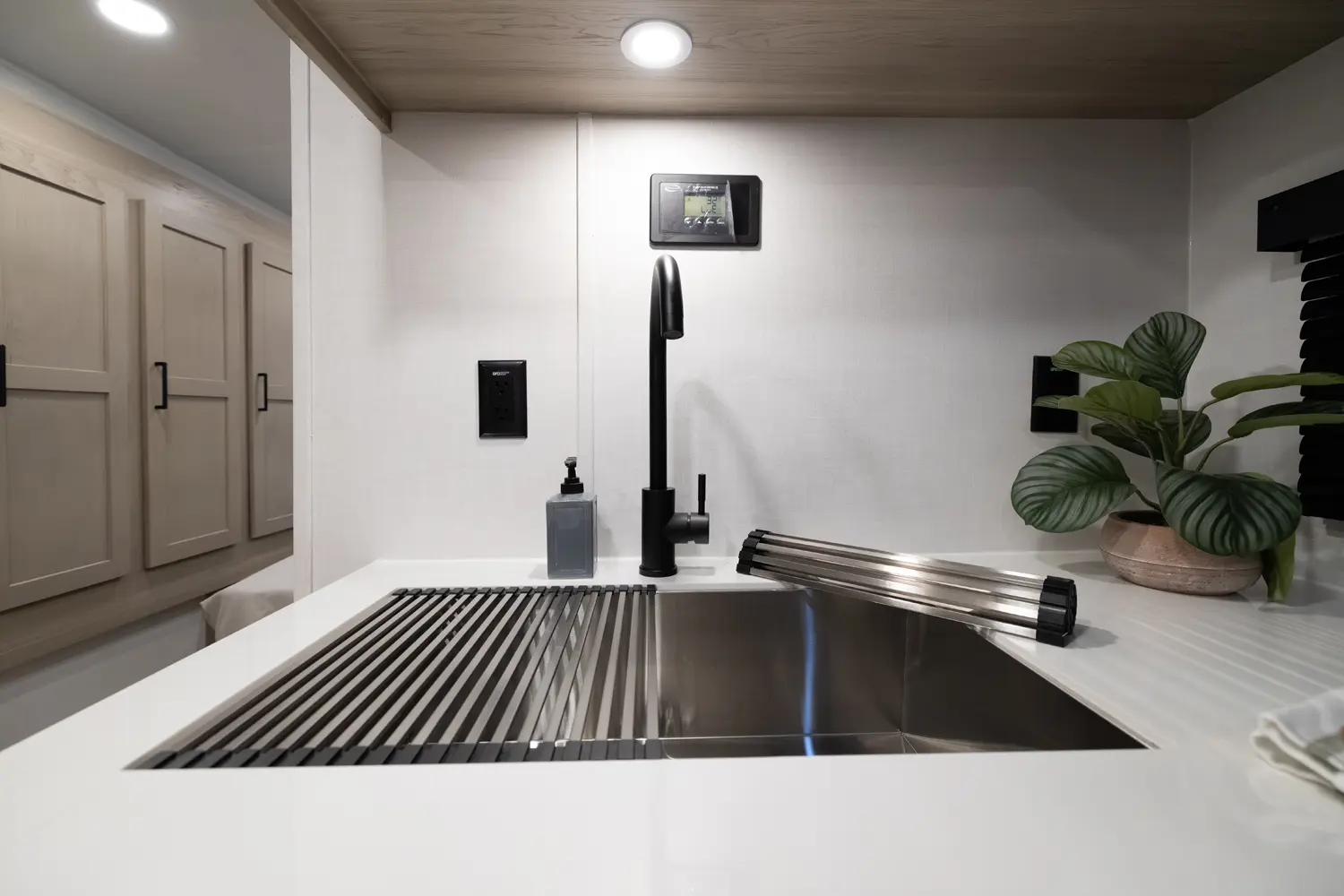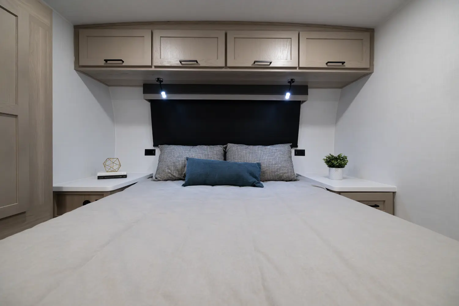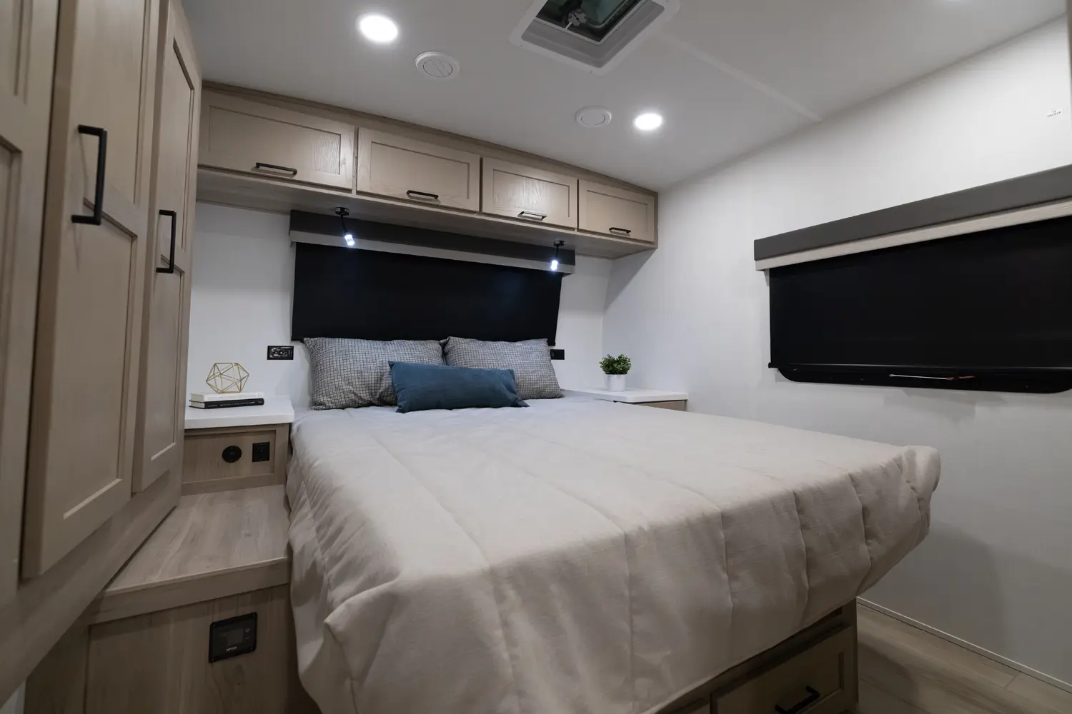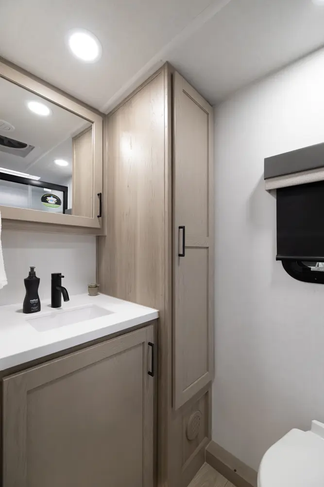 This unit is unique with its big 36" sliding doors leading to the bathroom and bedroom. These doors make moving around for a broad shouldered person easier and comfortable. The entertainment center is loaded with 32" tv, a residential-style soundbar and a fireplace space heater. Across from this lovely entertainment center is a 72" theatre seating which is perfect for reclining and watching a good movie.