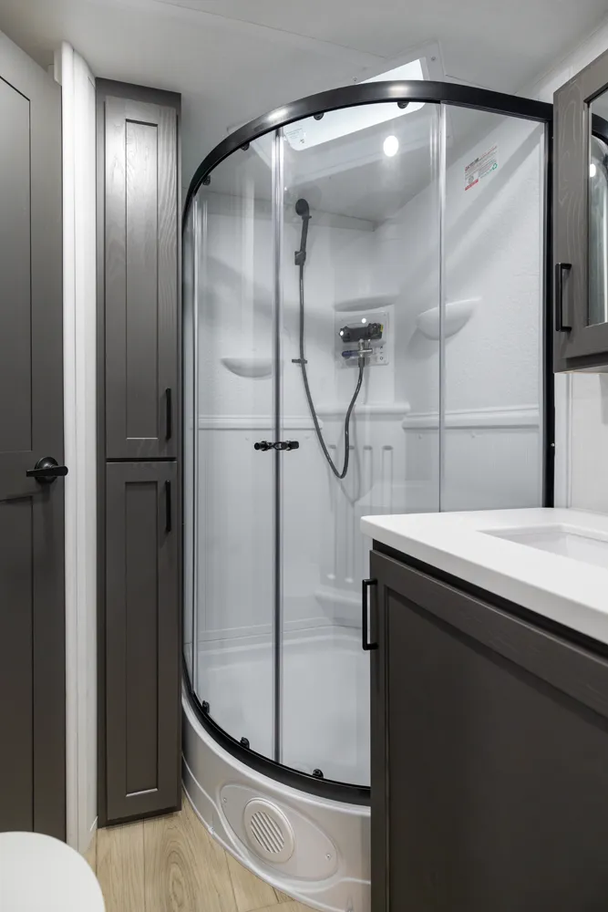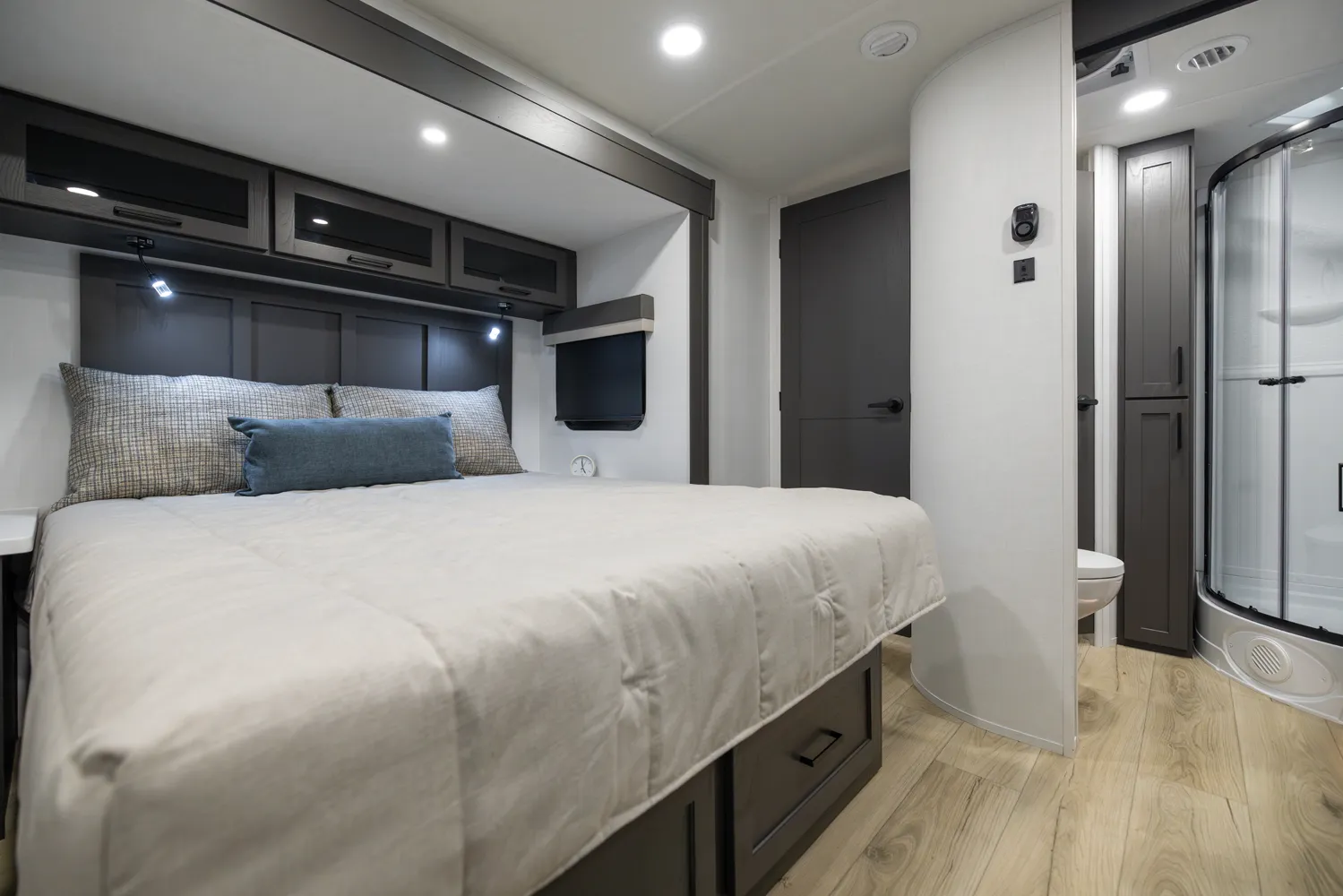 • Platinum Package: Auto Leveling, Frameless Windows, 1800W Inverter, MORryde Strut Assist Entry Step, Dual 30 LP Tanks