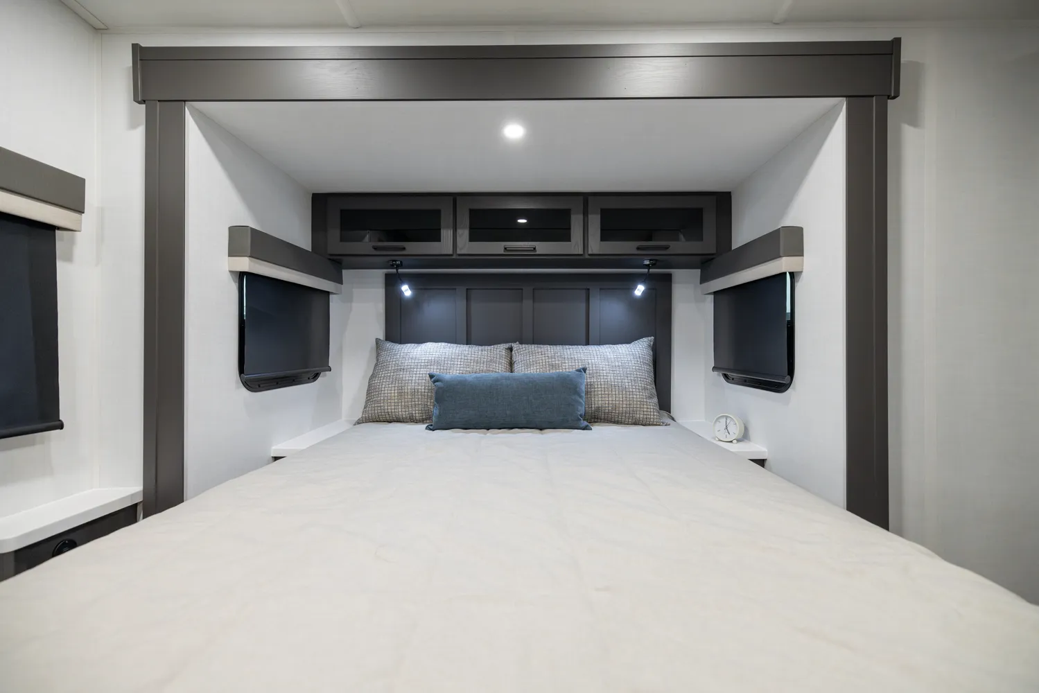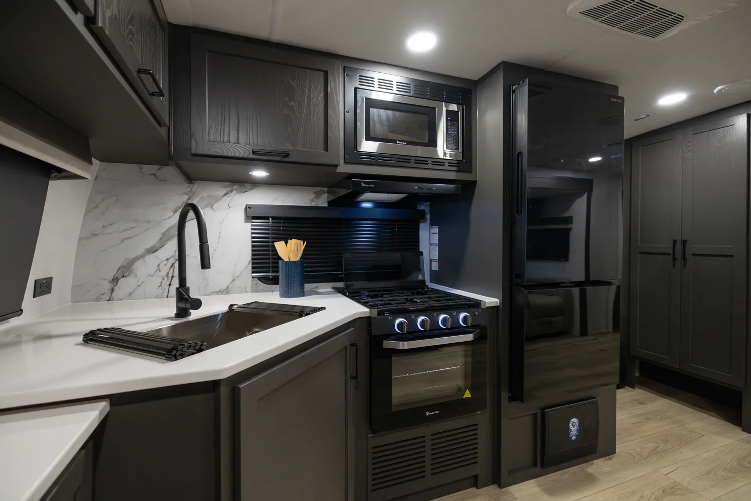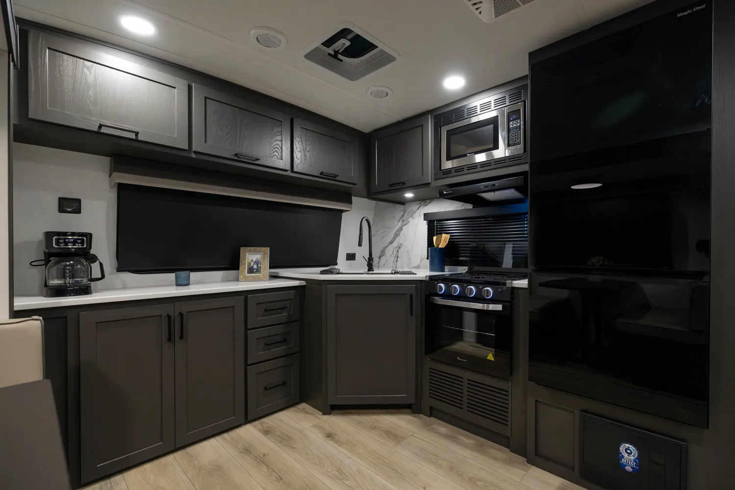 Holy counter space! This front kitchen offers a ton of counter space with a giant window to enhance the camping experience. The 67" theater seating is conveniently located right in front of the entertainment center and the cozy space heating fireplace. The master bedroom offers a big 60"x 80" queen bed slide out which makes the room feel residential. This bedroom has a separate entry and exit door that is also covered by the giant 21' awning.