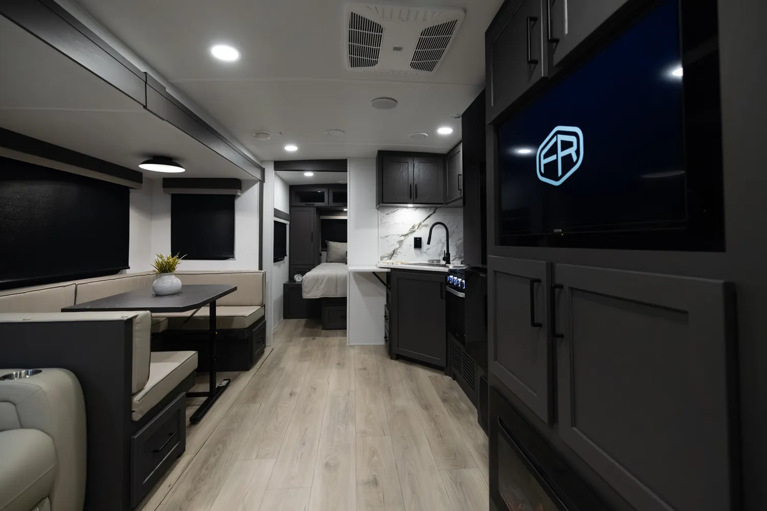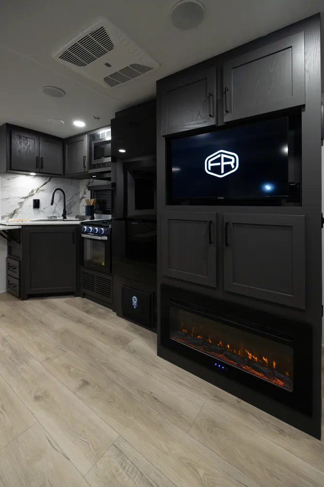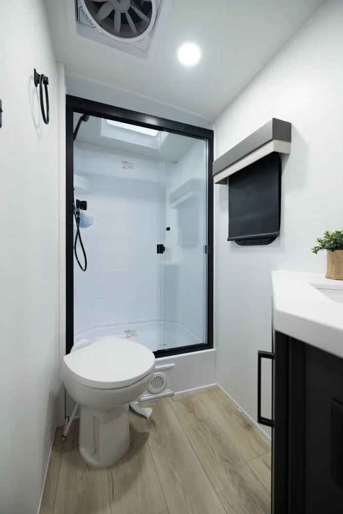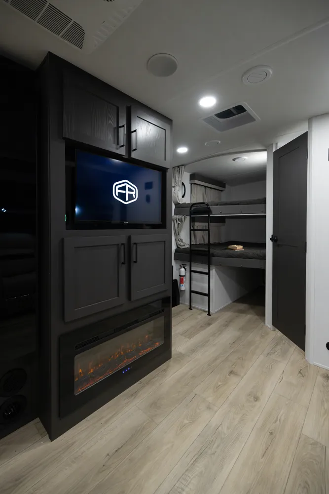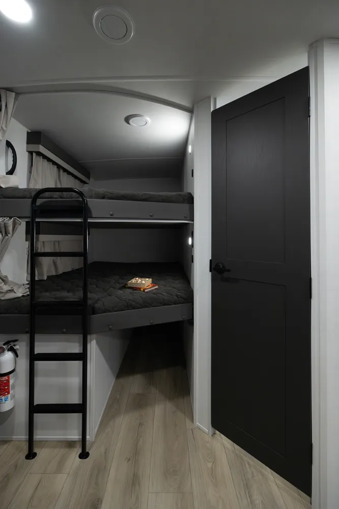 The Flagstaff Super Lite 27DBH is a versatile, family friendly floorplan featuring a front bedroom with a true queen bed and a large rear bathroom with a shower. The living area and kitchen include comfortable seating and a dinette for meals and relaxation, while the segregated rear bunk room provides privacy and extra sleeping space, making the 27DBH perfect for families or groups seeking comfort and functionality on the road.