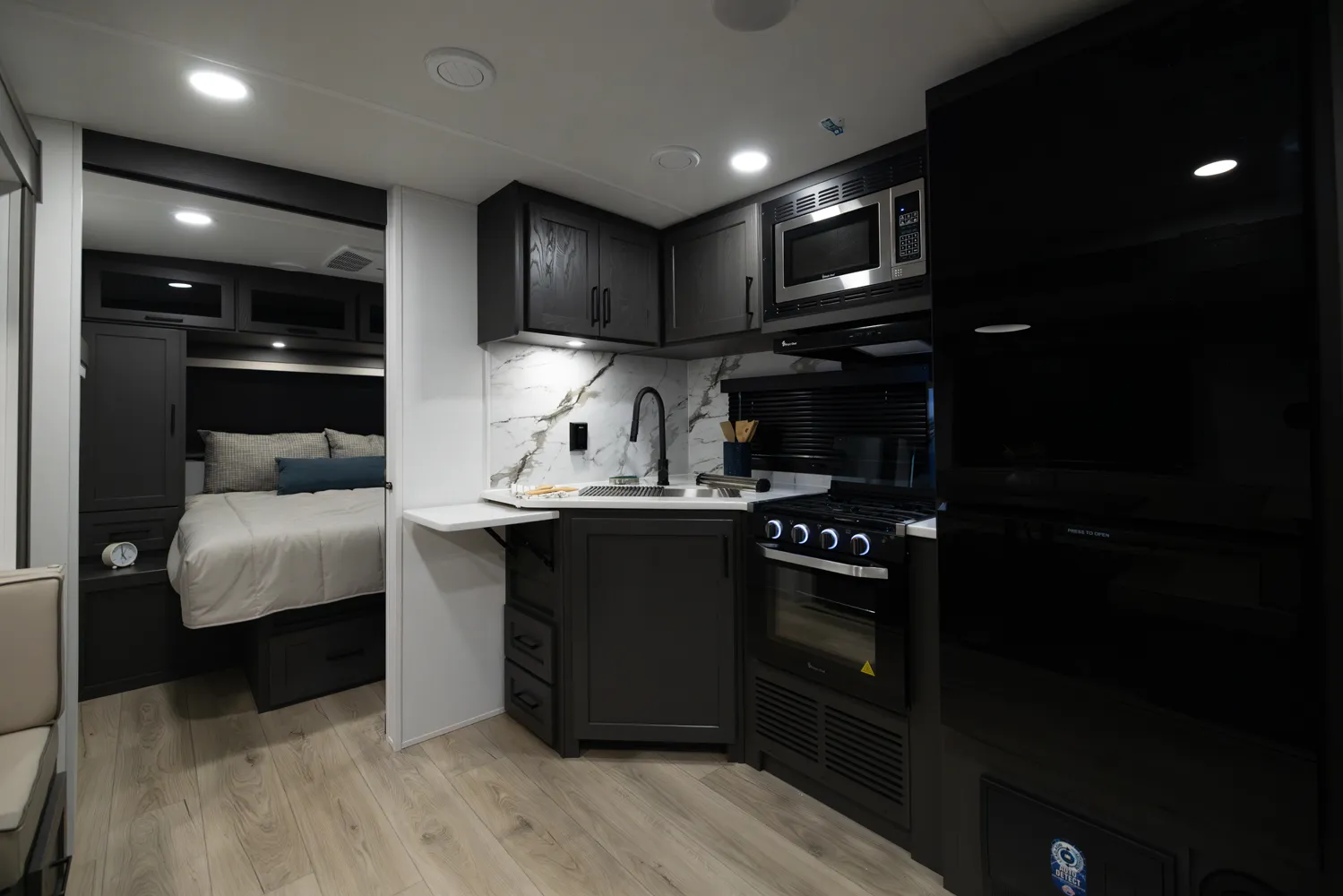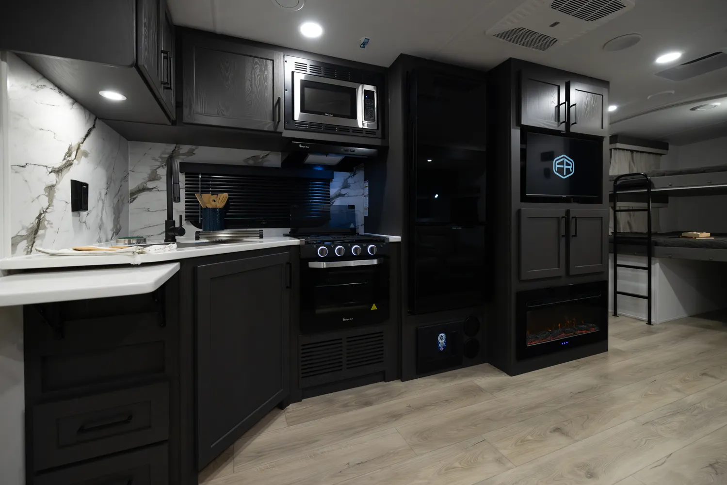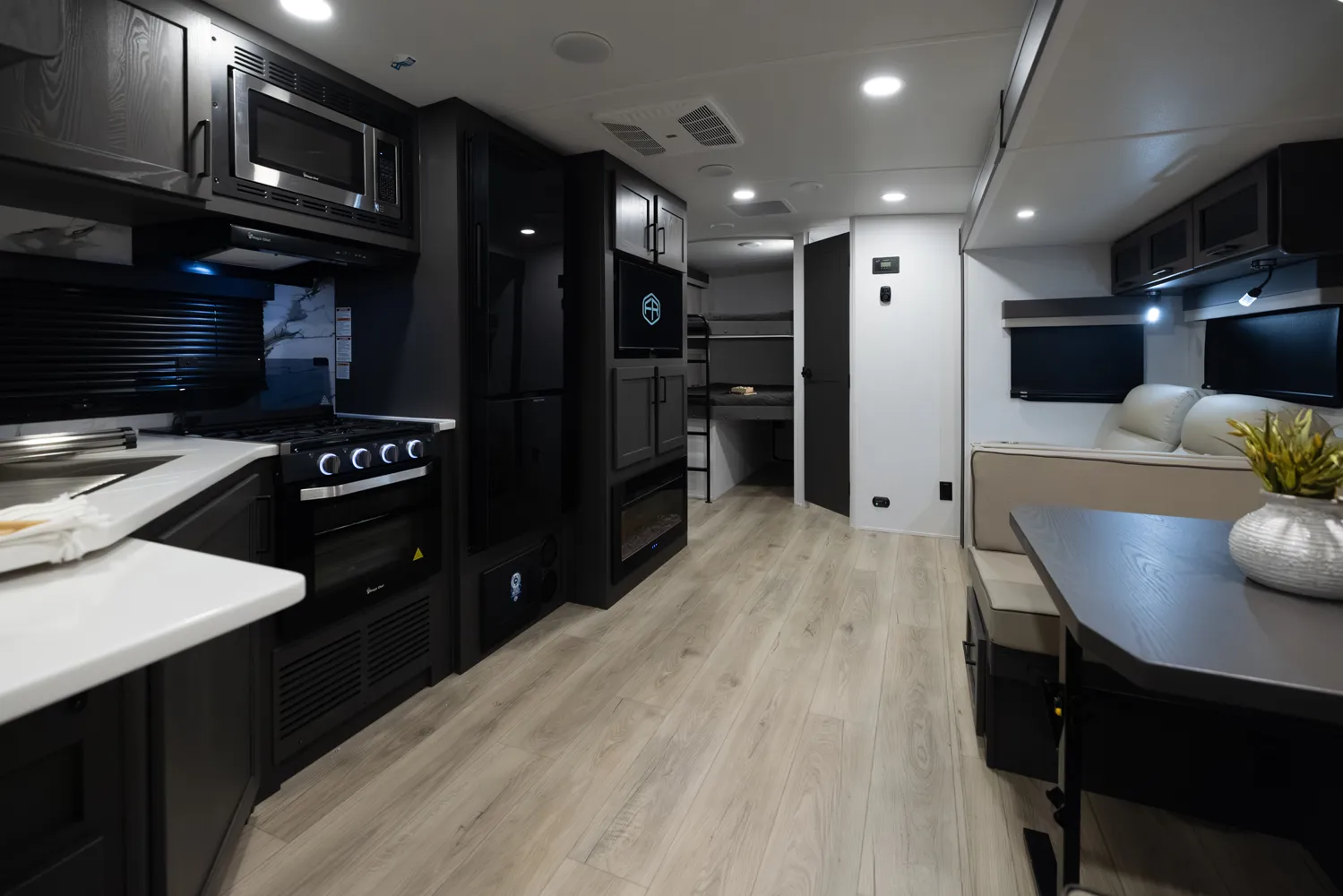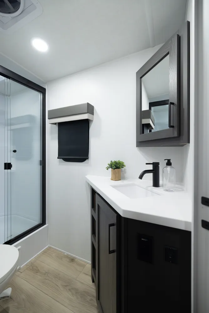 The Flagstaff Super Lite 27DBH is a versatile, family friendly floorplan featuring a front bedroom with a true queen bed and a large rear bathroom with a shower. The living area and kitchen include comfortable seating and a dinette for meals and relaxation, while the segregated rear bunk room provides privacy and extra sleeping space, making the 27DBH perfect for families or groups seeking comfort and functionality on the road.