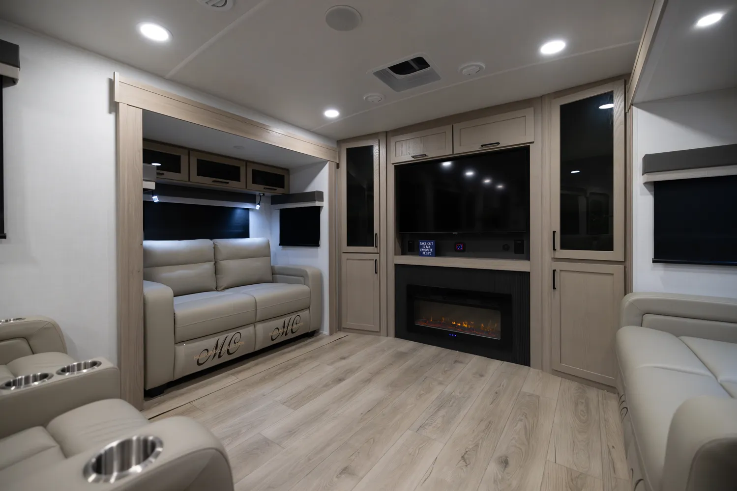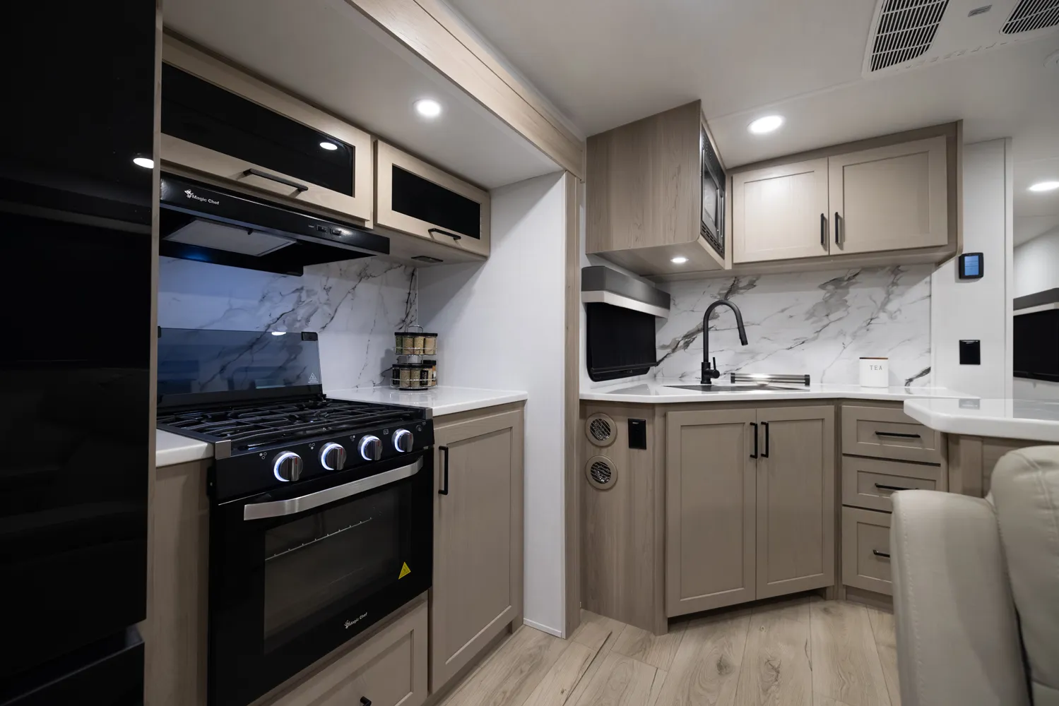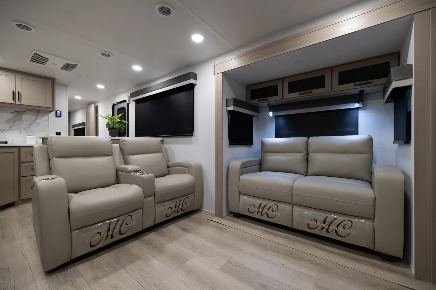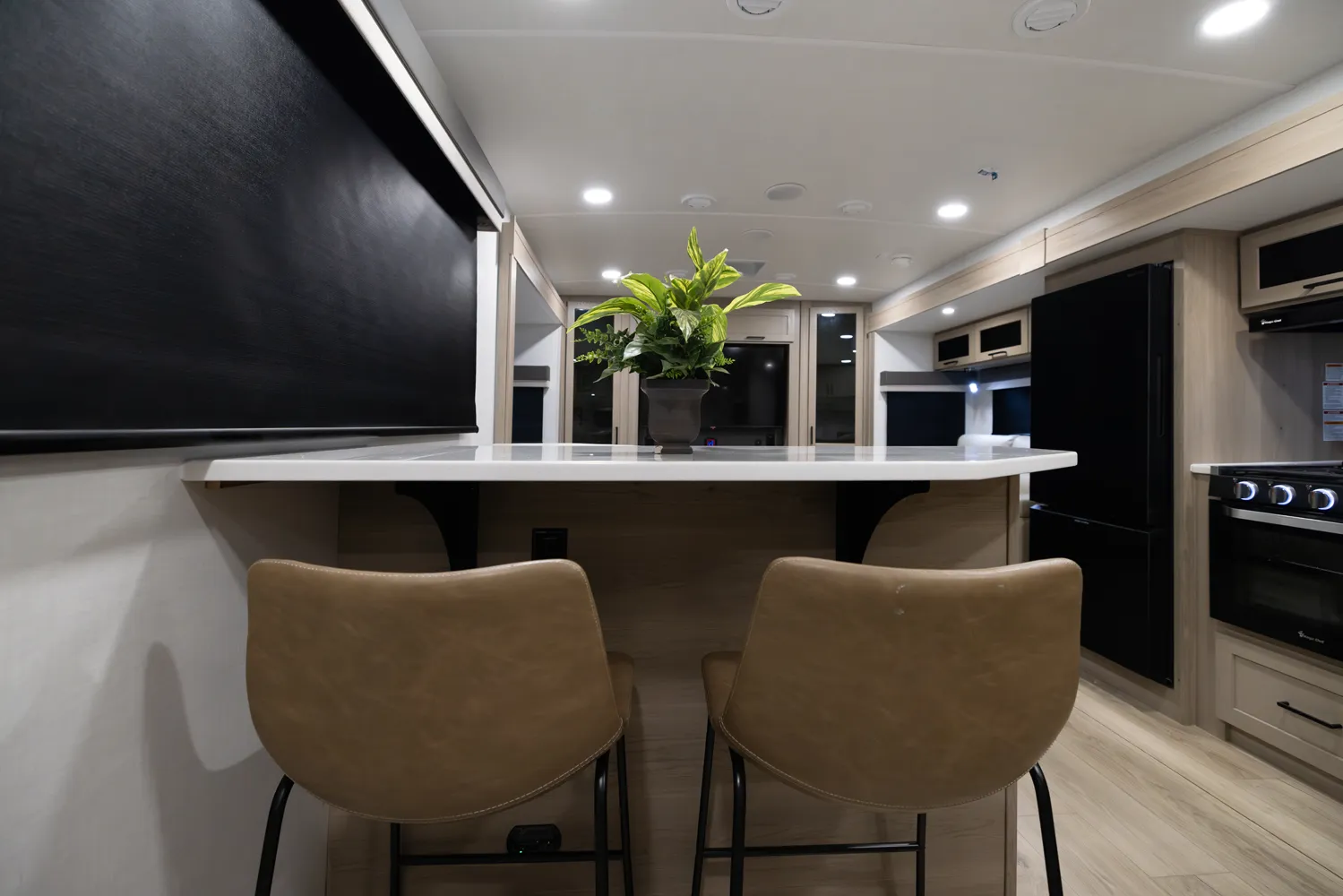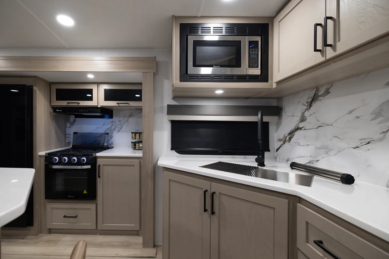 The Flagstaff 29SRL Super Lite impresses with a beautiful rear entertainment center and rear living area featuring two 60" hide-a-beds and a 60" theater seat. In the kitchen, enjoy a table with barstools and plenty of countertop space. In the bathroom, a large rectangular shower, and in the front bedroom, a true queen bed, making this Super Lite perfect for comfort, style, and family fun on the road.