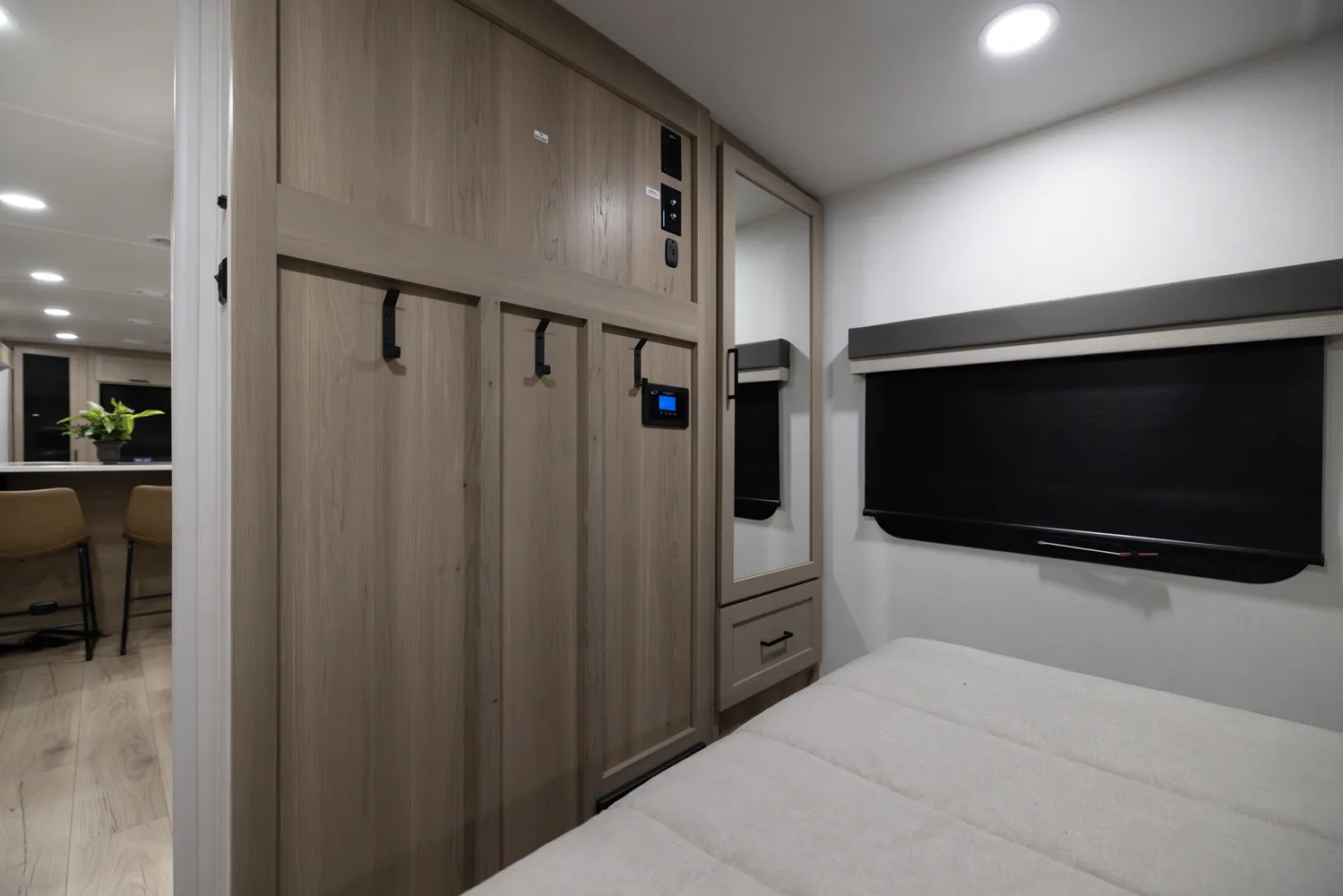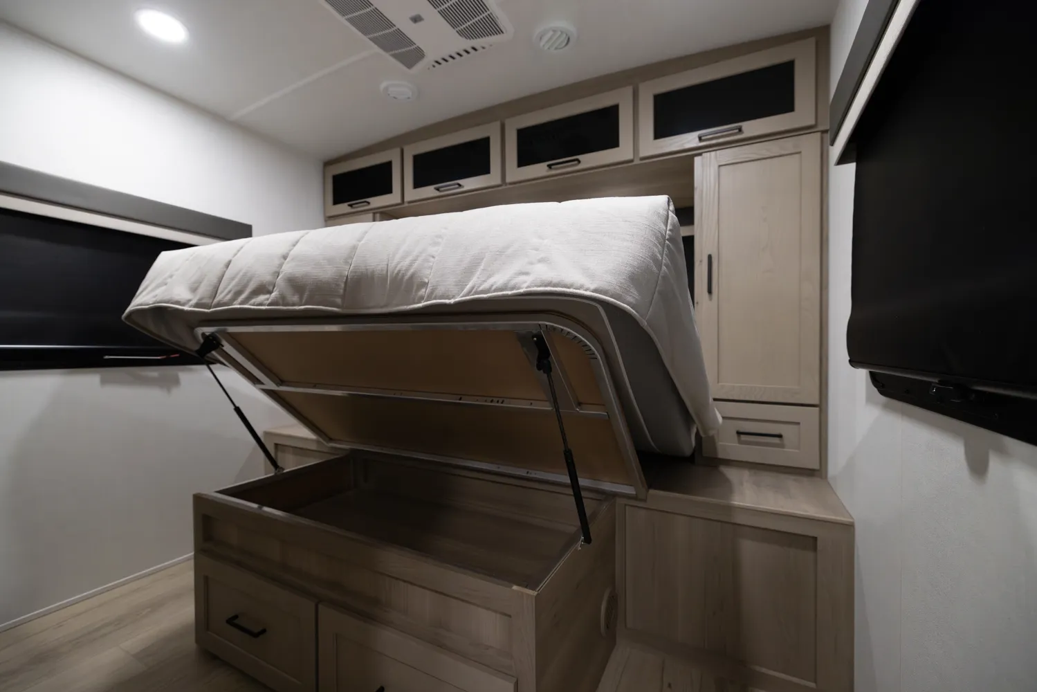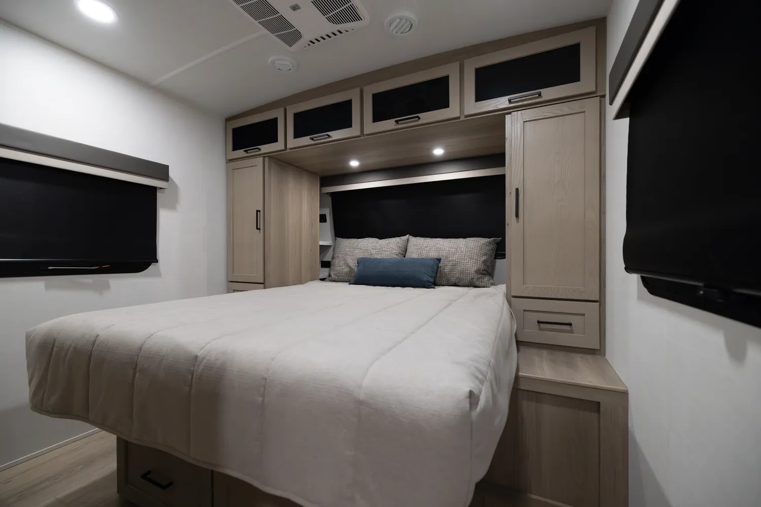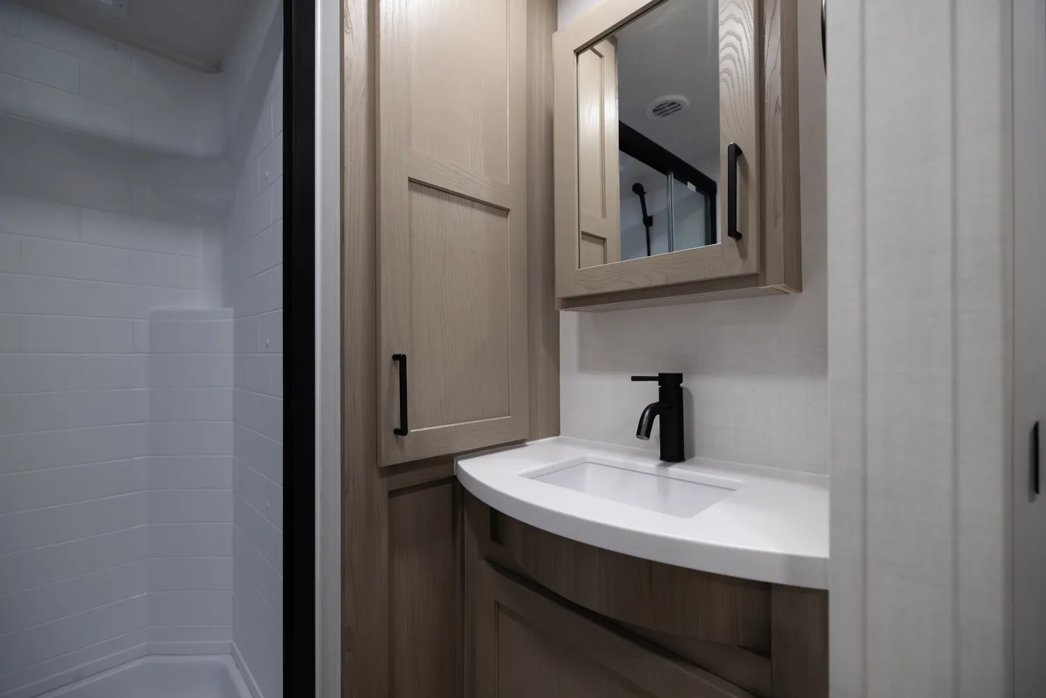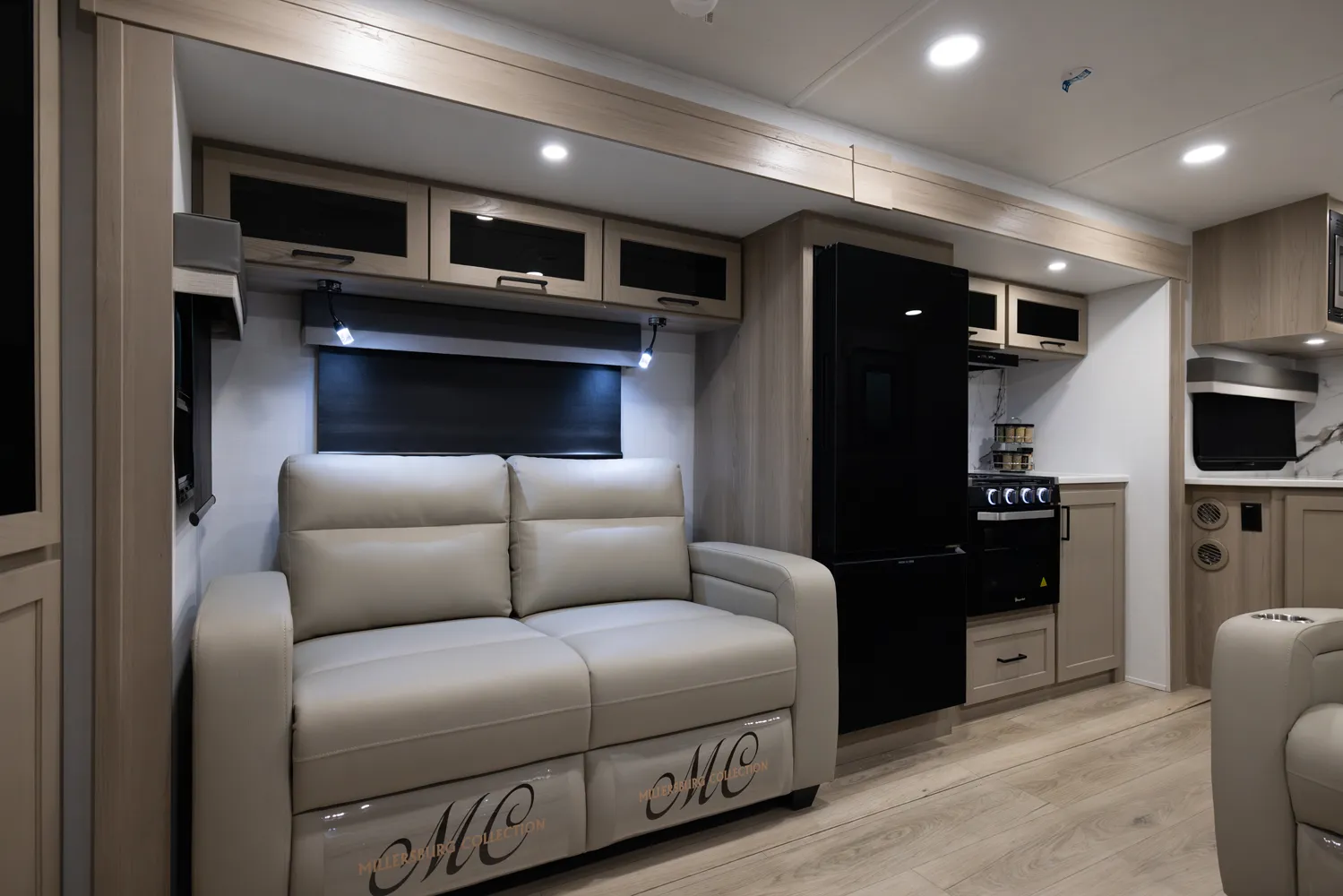 The Flagstaff 29SRL Super Lite impresses with a beautiful rear entertainment center and rear living area featuring two 60" hide-a-beds and a 60" theater seat. In the kitchen, enjoy a table with barstools and plenty of countertop space. In the bathroom, a large rectangular shower, and in the front bedroom, a true queen bed, making this Super Lite perfect for comfort, style, and family fun on the road.