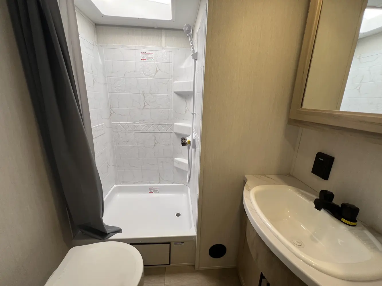 The Cherokee Grey Wolf 27LH by Forest River is a stylish and functional travel trailer with a focus on affordability, perfect for modern camping. Despite its compact 33-foot, 6-inch length, the 27LH feels incredibly spacious, thanks to its residential-style sofa and large windows that flood the interior with natural light. The bedroom is also impressive with a king size bed and plenty of wardrobe space.