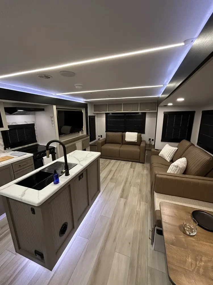Want an outside kitchen, but don't want bunk beds? Then the 273RL is the camper for you! Two opposing slides offer an island, and tons of indoor space. The large awning offers lots of shaded entertaining space and covers the outdoor kitchen.