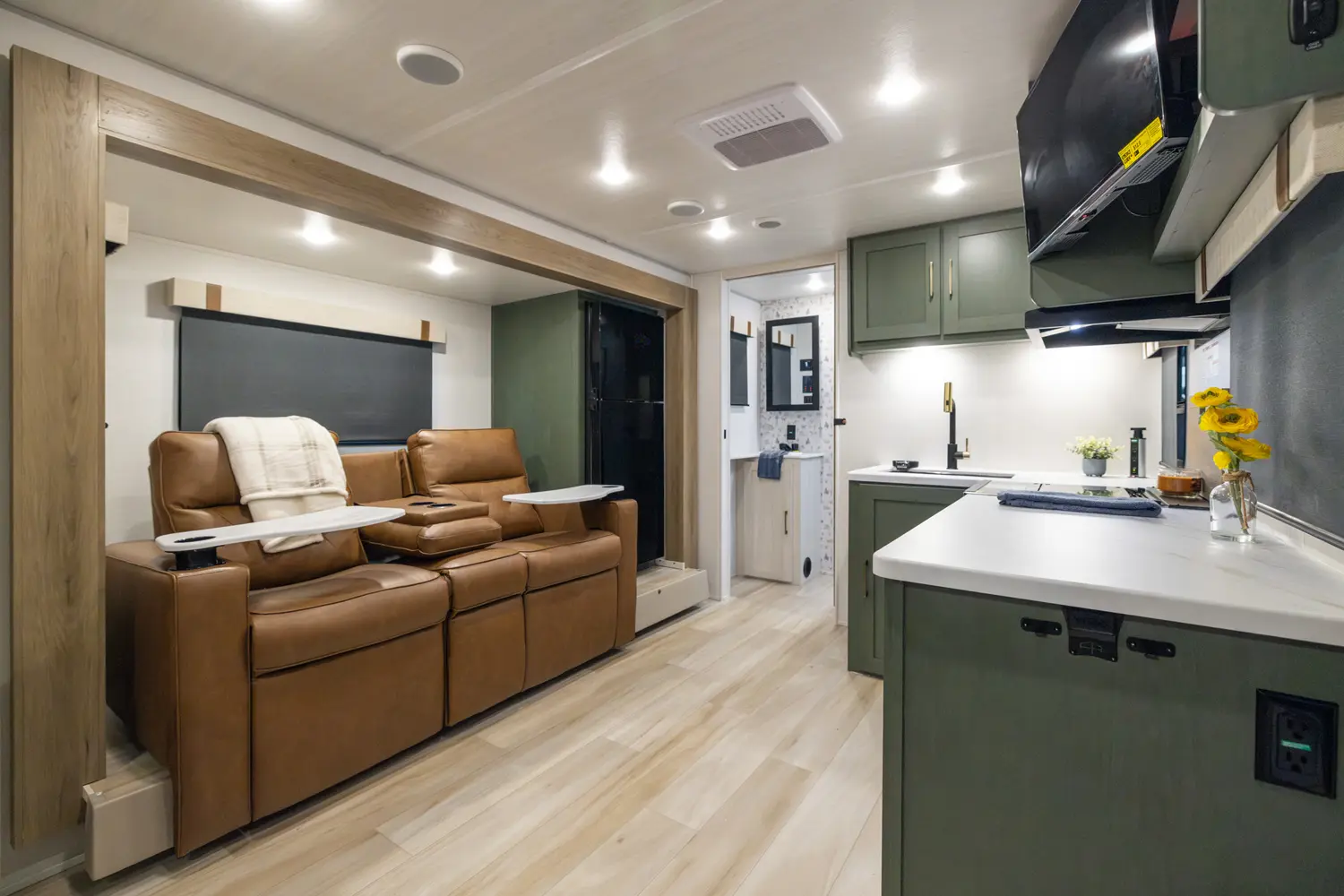 Spacious and functional, this travel trailer features a front queen bedroom with dual wardrobes, walk-through bath, tri-fold sofa slide-out, booth dinette, and kitchen with microwave air fryer, fridge, and pantry. Built for extended-season use with heated enclosed underbelly, radiant foil insulation, 12V tank pads, 19' power awning, and rugged construction, ready for any adventure.