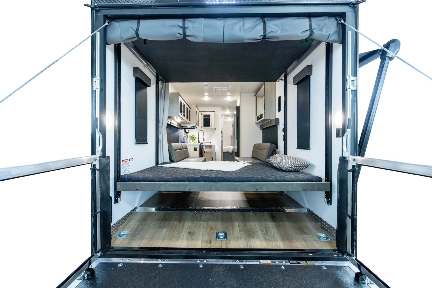 This Toy Hauler is a Travel Trailer that will grant you a vast majority of the layout to be optional cargo area. With 11' of cargo space in the garage, make sure to bring all the toys. The Flip Up Sleeper Sofa's in the garage of this floorplan provide sleeping areas for you and your guests. An optional queen bed electric lift can also be added to the garage for more sleeping quarters, too. Furthermore, an optional outside kitchen can be added for those of you who like to cook in nature.