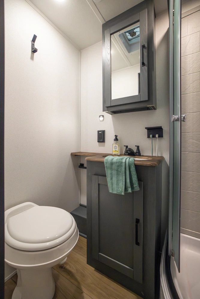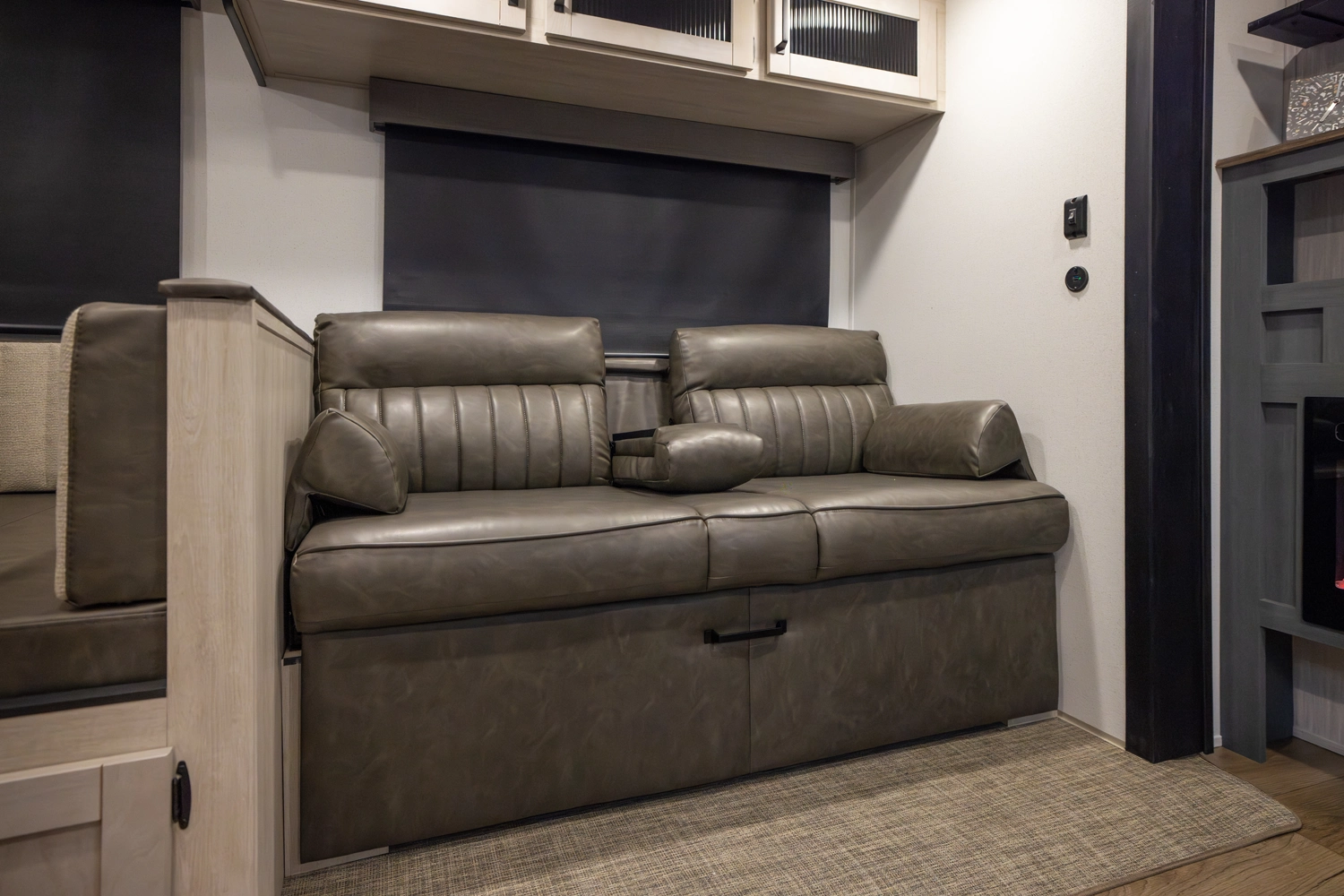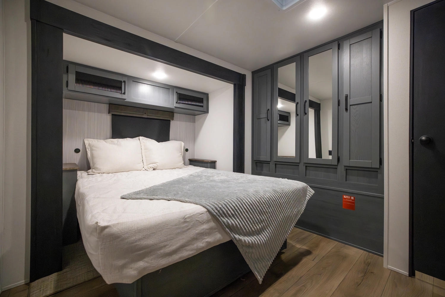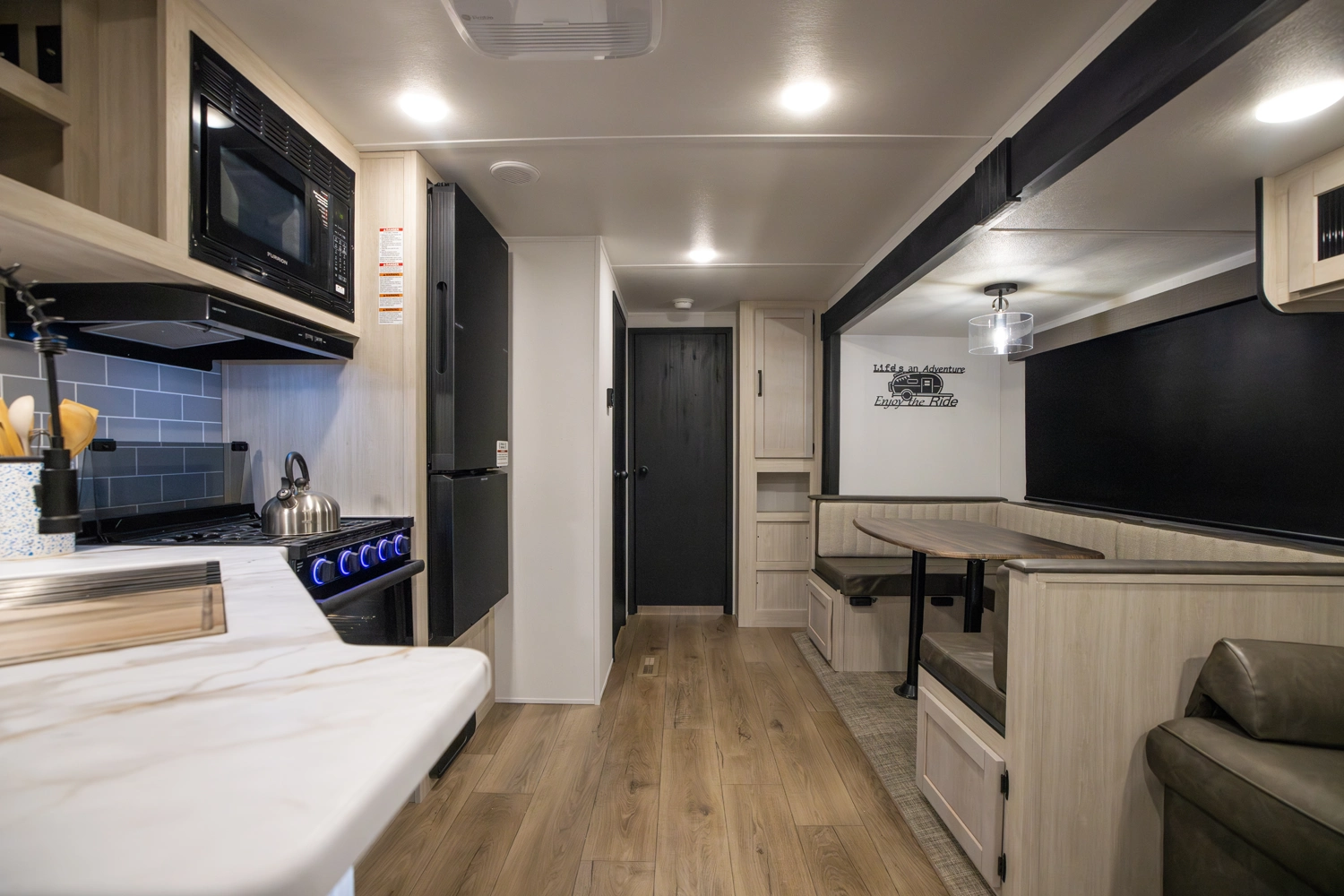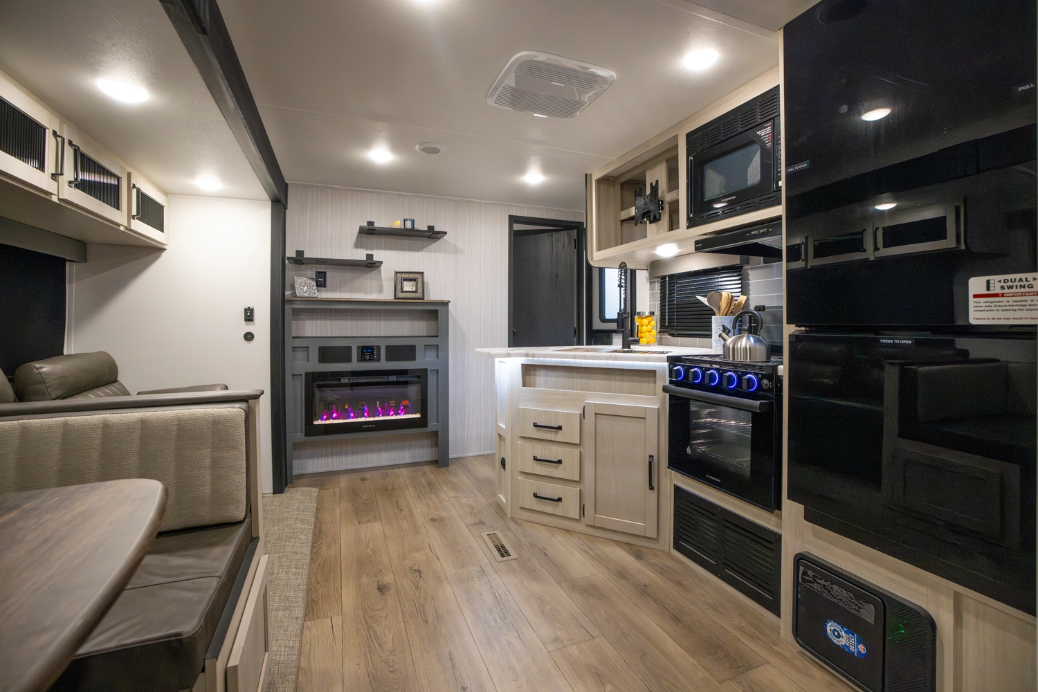 This rear bunk travel trailer provides great space for you and all of your family. With three slides, all on one side of the unit, it will grant you and the guests room everywhere you go. The L shaped countertop in the kitchen gives you the ability to entertain without feeling cramped. The front bedroom has a slide out containing a bed, along with a deep closet. Furthermore, you are provided with a great deal of natural light through out with windows in every room.