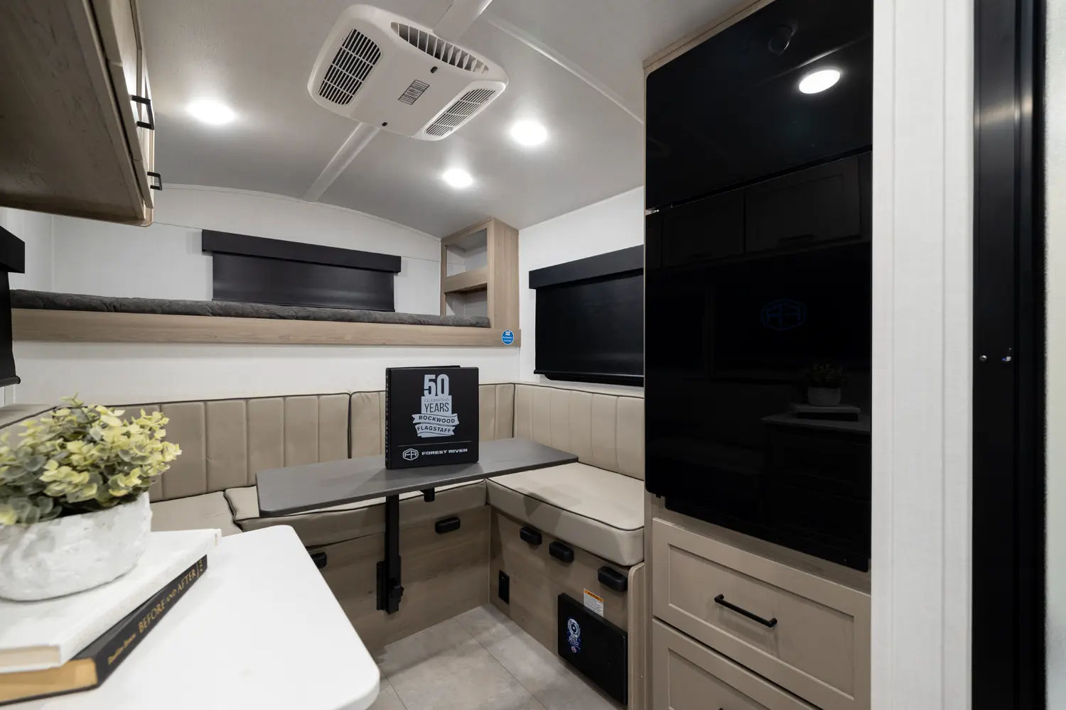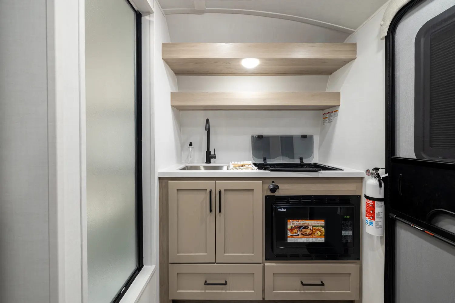The 15RDG Offers a huge 80” by 54” U-shaped dinette that converts to a bed. A flip-up bunk that doubles as shelf storage when not in use. A thoughtful convection microwave, sink & stove top inside as well as a massive outdoor rear kitchen. With The convenience of a wet bath this model delivers comfort, versatility and fun wherever the road takes you.