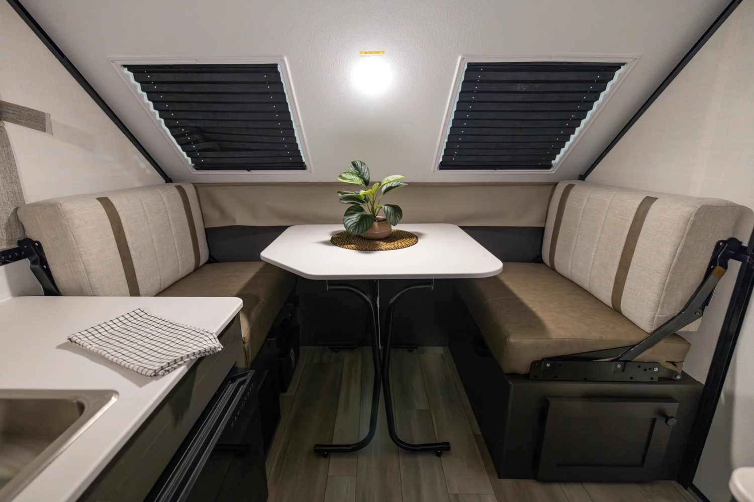 The Rockwood A101RB is a traditional A-frame that blends simplicity with smart design. It features a front 33" x 80" dinette and a rear 54" x 80" bed that flips up for easy access. Inside, you'll have a convenient fridge, and outside, an easy-reach storage trunk and a griddle for cooking up meals wherever you go.