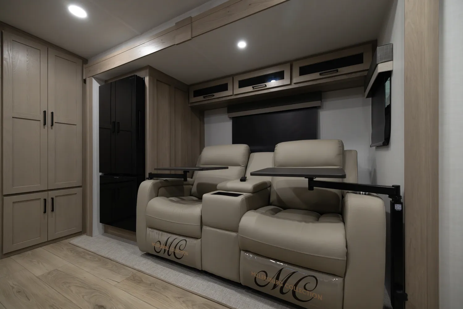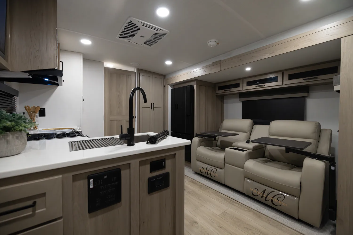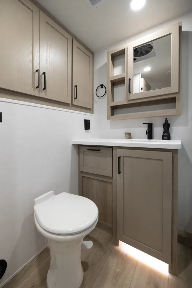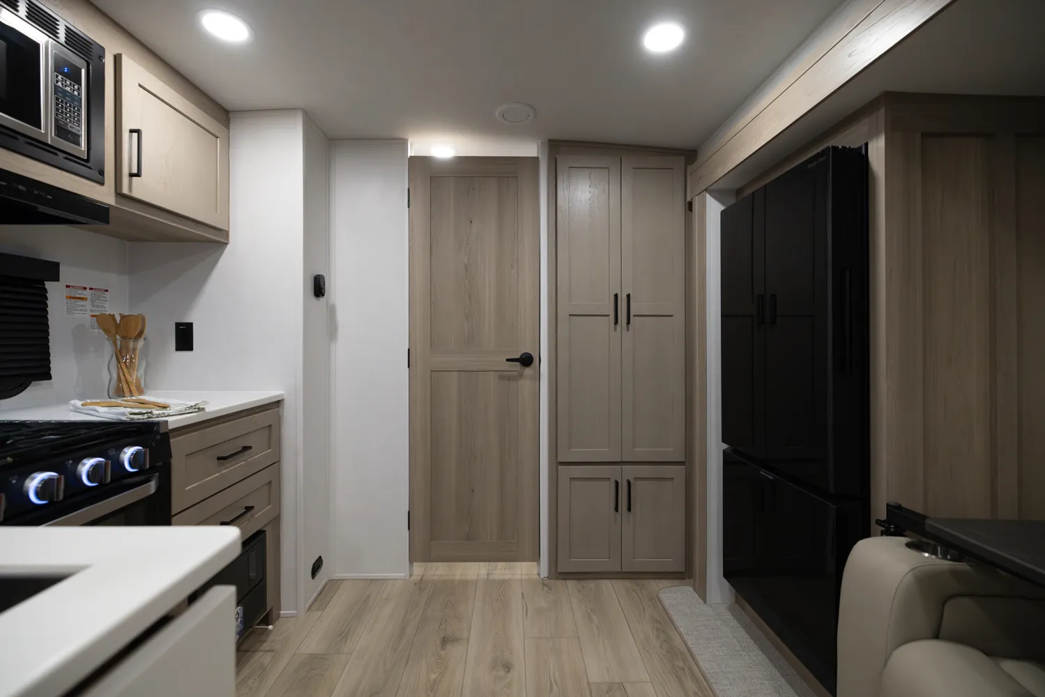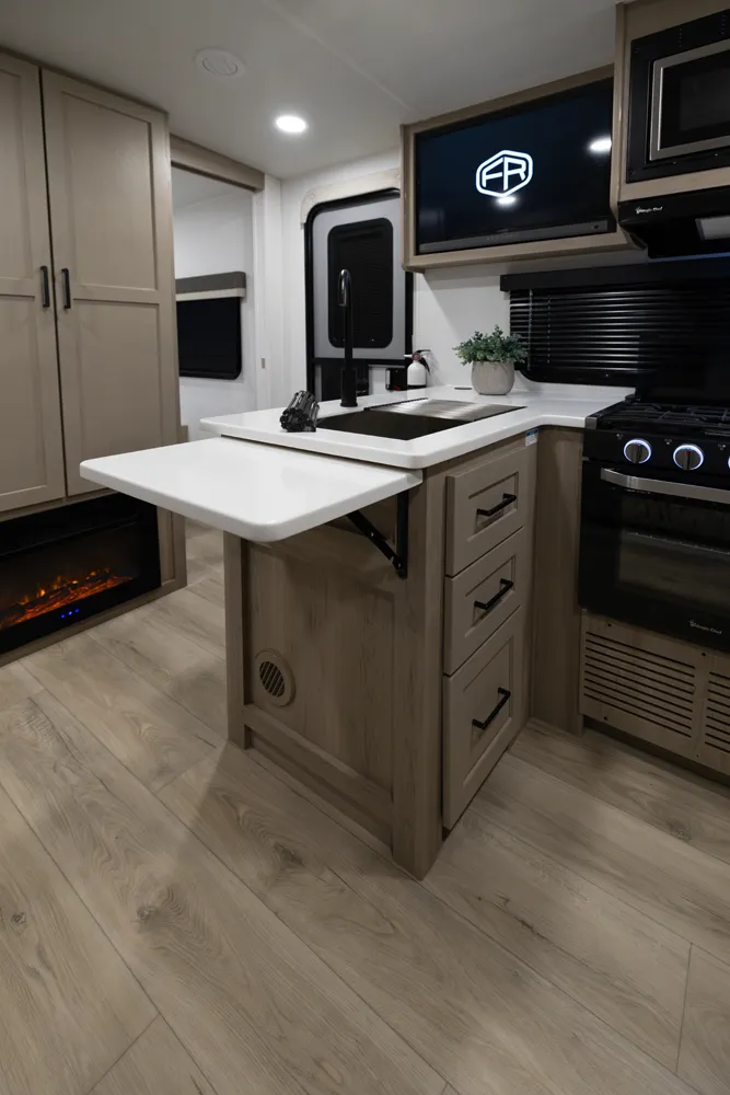 The outside kitchen on this Rockwood Mini Lite featuring our new griddle, a refrigerator and grill makes cooking so enjoyable and flexible. No need to take the smell of cooking bacon inside. The large wardrobe slide makes packing and organization so easy. The large pantry next to the bathroom covers all your kitchen storage needs as well. The center position of the television in your entertainment spaces makes viewing from any part of the living quarters easy.