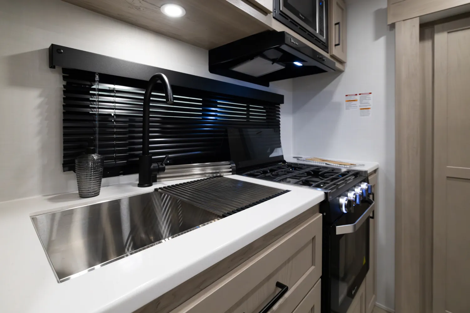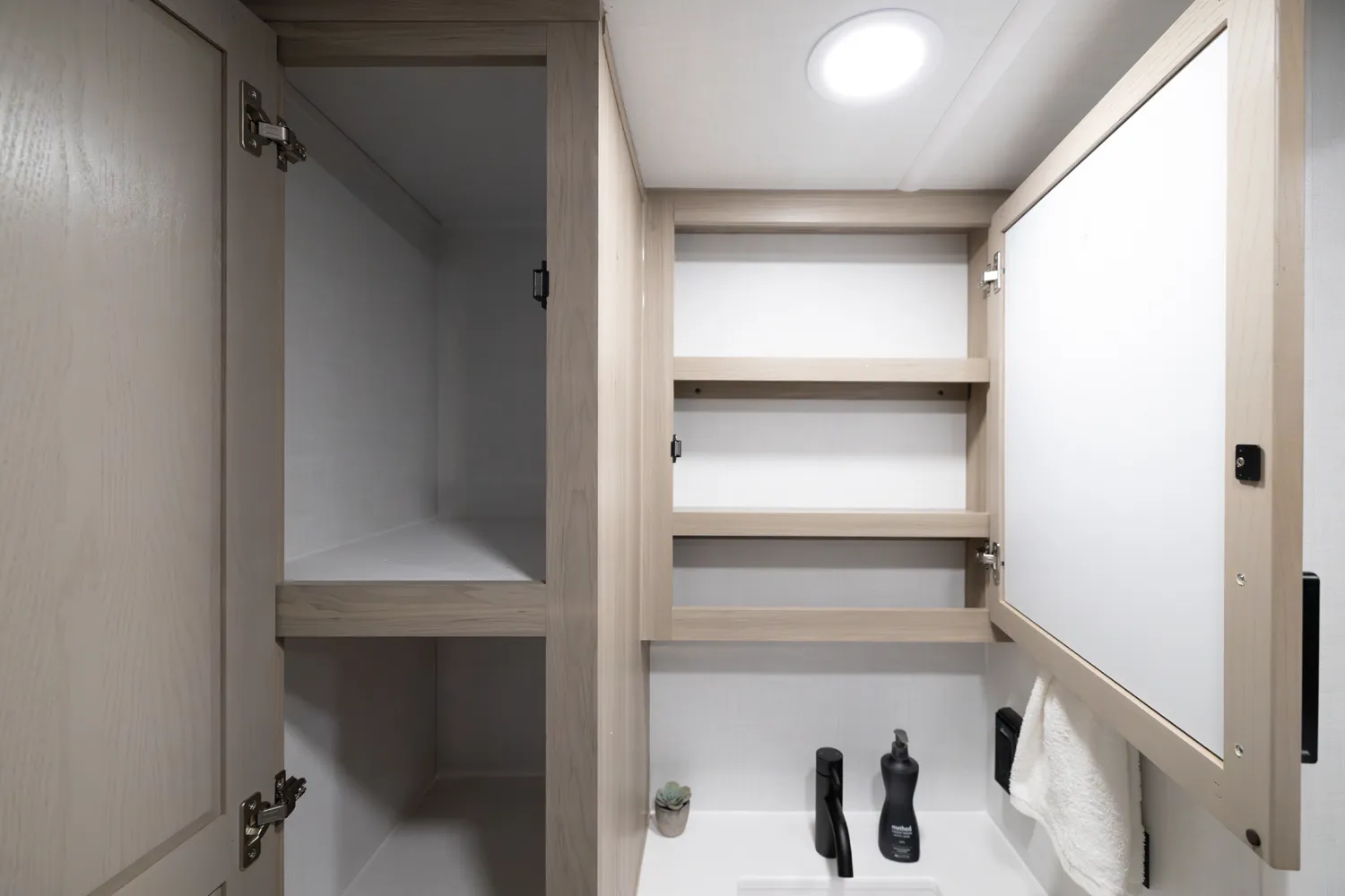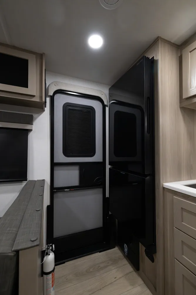 The 2515S offers a spacious convenient layout with two entry doors providing easy access to the kitchen, bedroom, and bathroom, all while the slides are retracted. The rear kitchen features ample counter space while the living area includes a U-shaped dinette and theater seating. (optional hide-a-bed) The wardrobe slide adds generous storage making this a perfect choice for families or couples seeking flexibility and functionality on the road.