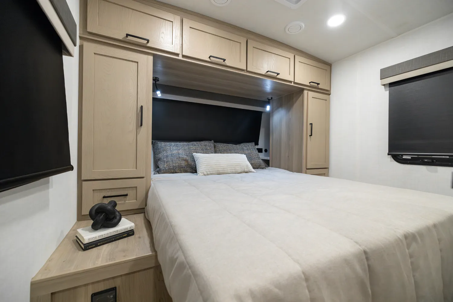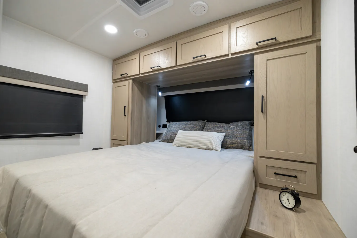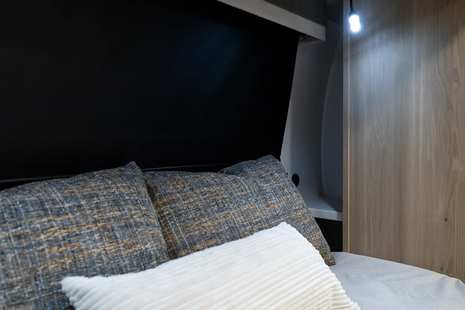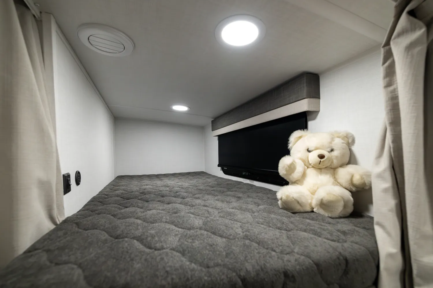 The 2520BH is a bunkhouse layout featuring a segregated front bedroom with a true queen bed and dual wardrobe closets for plenty of personal storage. In the main living area, you'll find a large U-shaped dinette, a spacious kitchen and two 36" x 71" bunks- perfect for kids or guests. This layout blends privacy, comfort, and roominess. An ideal setup for families and groups seeking versatile space on the road.