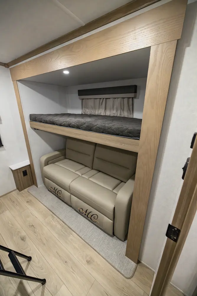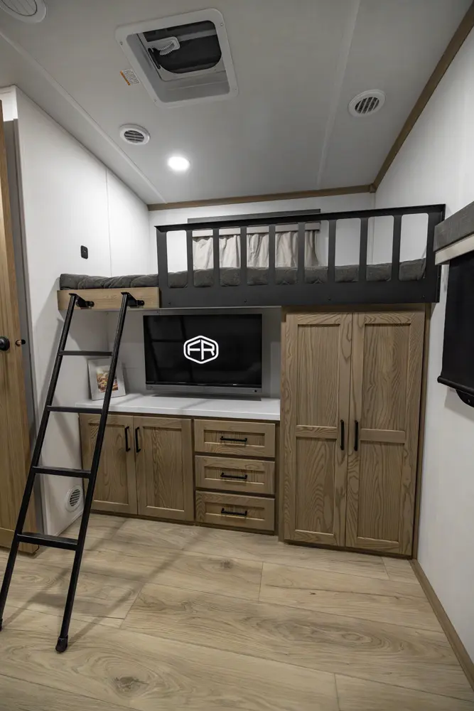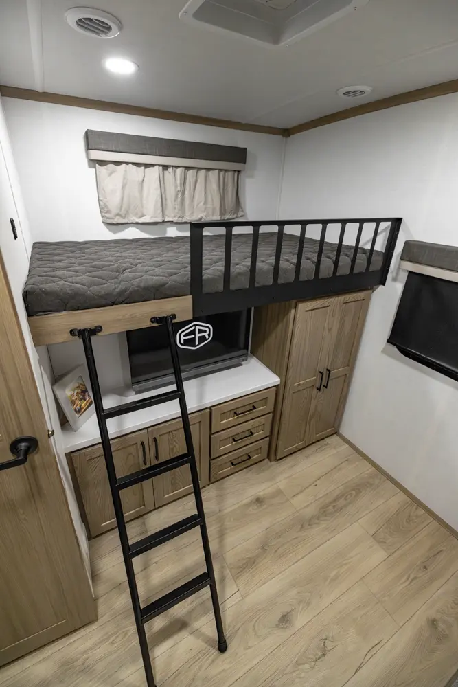 This four slide bunk model has great sleeping arrangements and a U-Dinette that can seat everyone for dinner. The outside camp kitchen has a large refrigerator and cooking stove to feed everyone you are sleeping for the trip. The bunkroom has its own entertainment and hard door for separation from the rest of the coach. The king bed option and the washer and dryer prep make this coach great on every occasion for any family.
