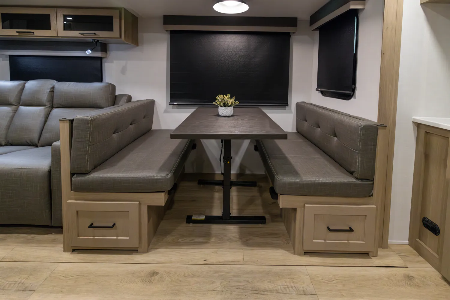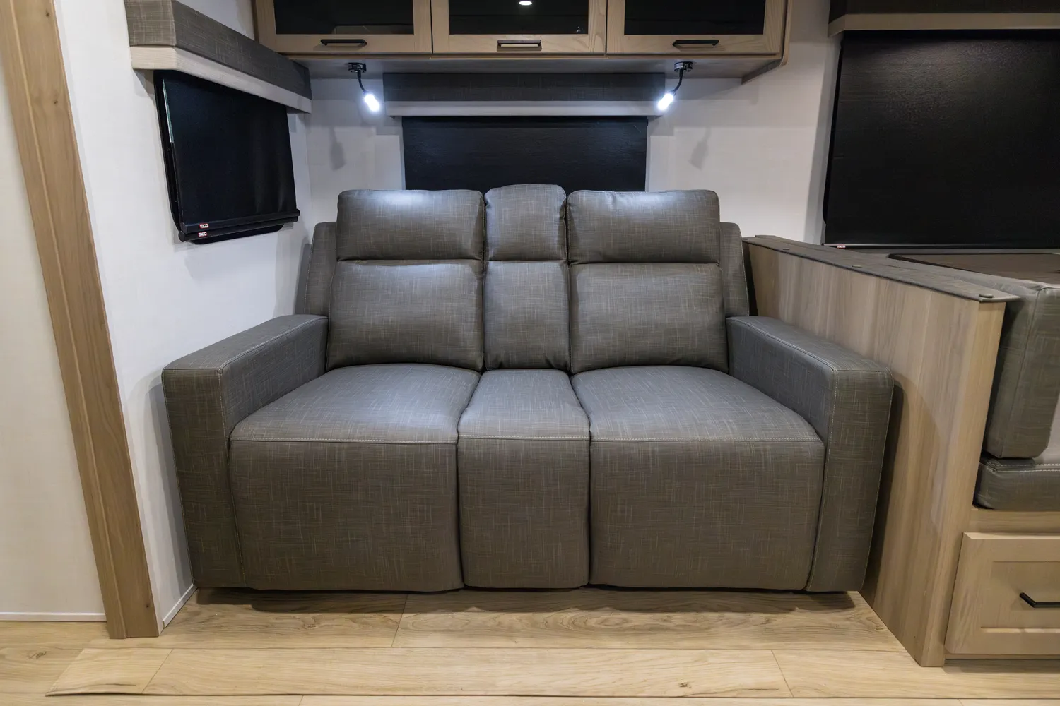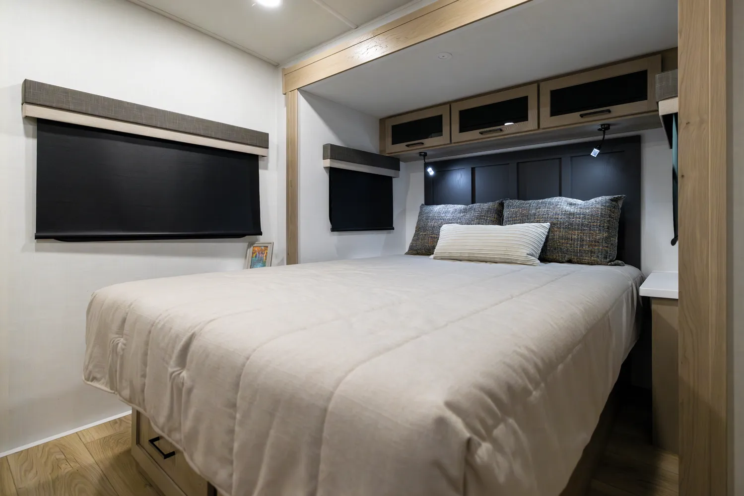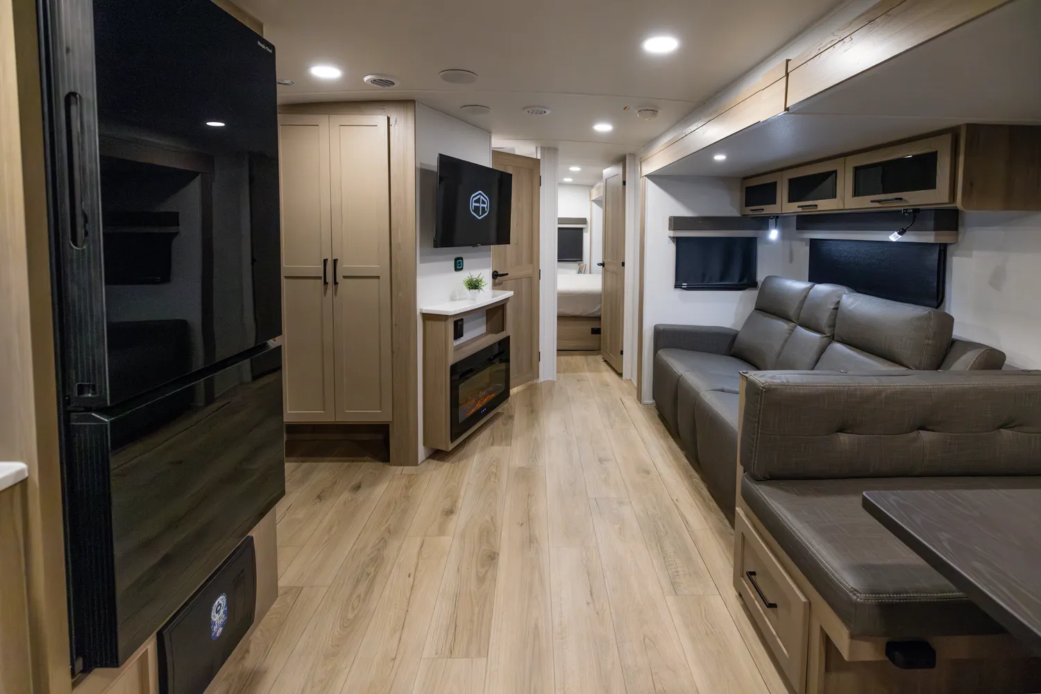 Holy counter space! This front kitchen offers a ton of counter space with a giant window to enhance the camping experience. The 67" theater seating is conveniently located right in front of the entertainment center and the cozy space heating fireplace. The master bedroom offers a big 60"x 80" queen bed slide out which makes the room feel residential. This bedroom has a separate entry and exit door that is also covered by the giant 21' awning.