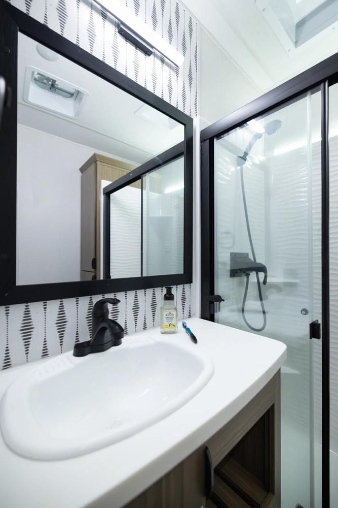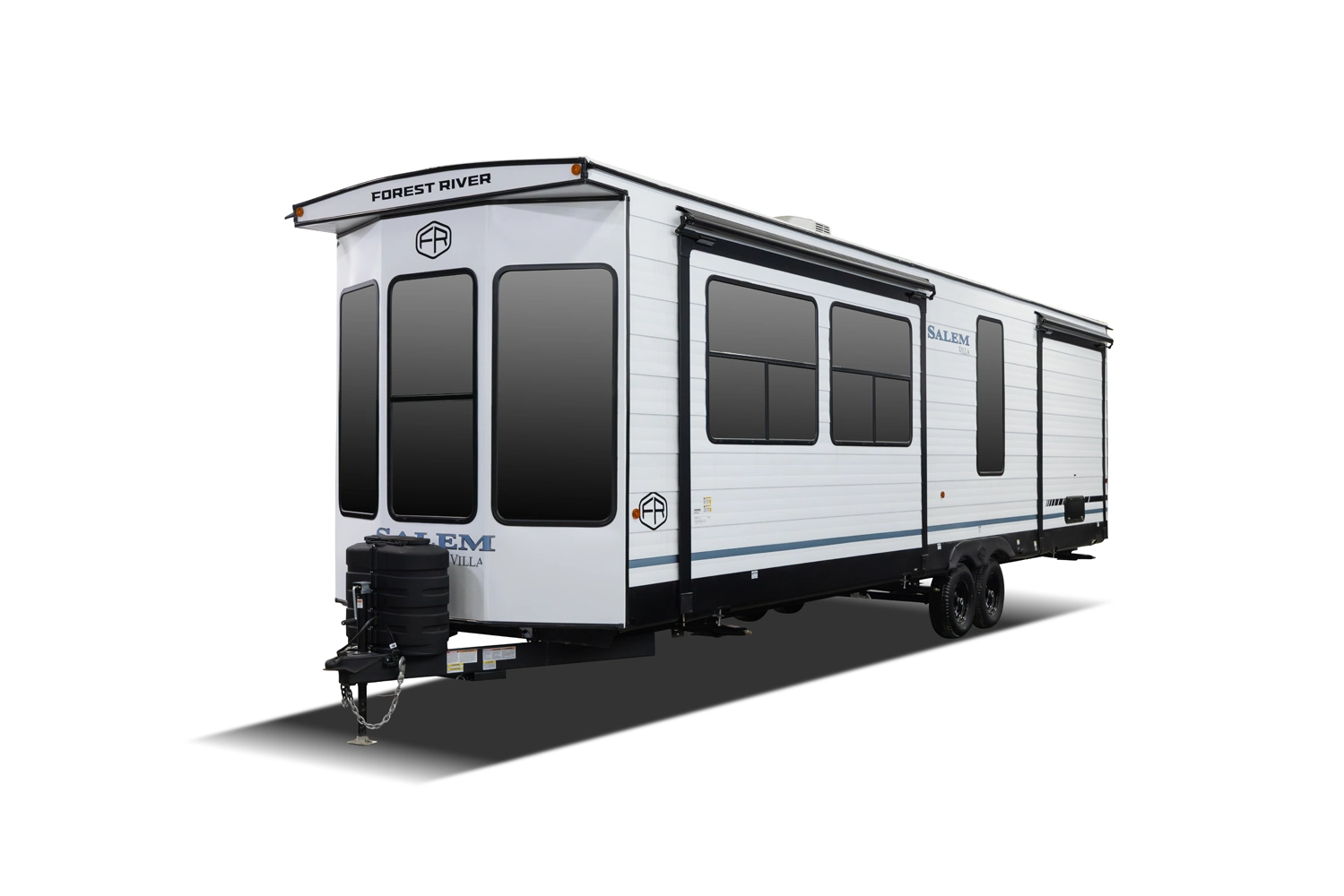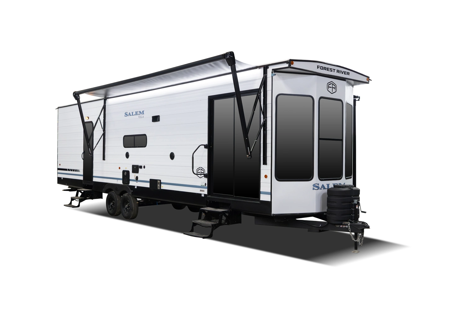 The Salem Villa 353FLB is the perfect destination trailer for making memories! The rear king bedroom provides plenty of space to stretch out, plus loads of storage space, while the adjacent bathroom gives you a linen closet and walk-in shower with a built-in seat. The large kitchen area includes a stove top plus oven, a residential refrigerator, and farmhouse sink. The living area has both theater seating and sofa with panoramic windows for great campsite views.