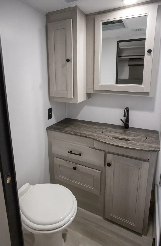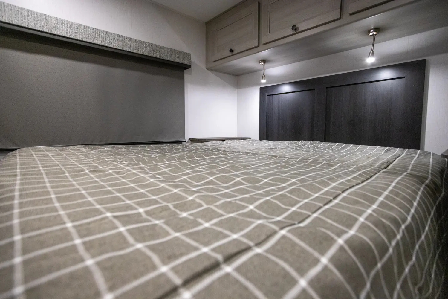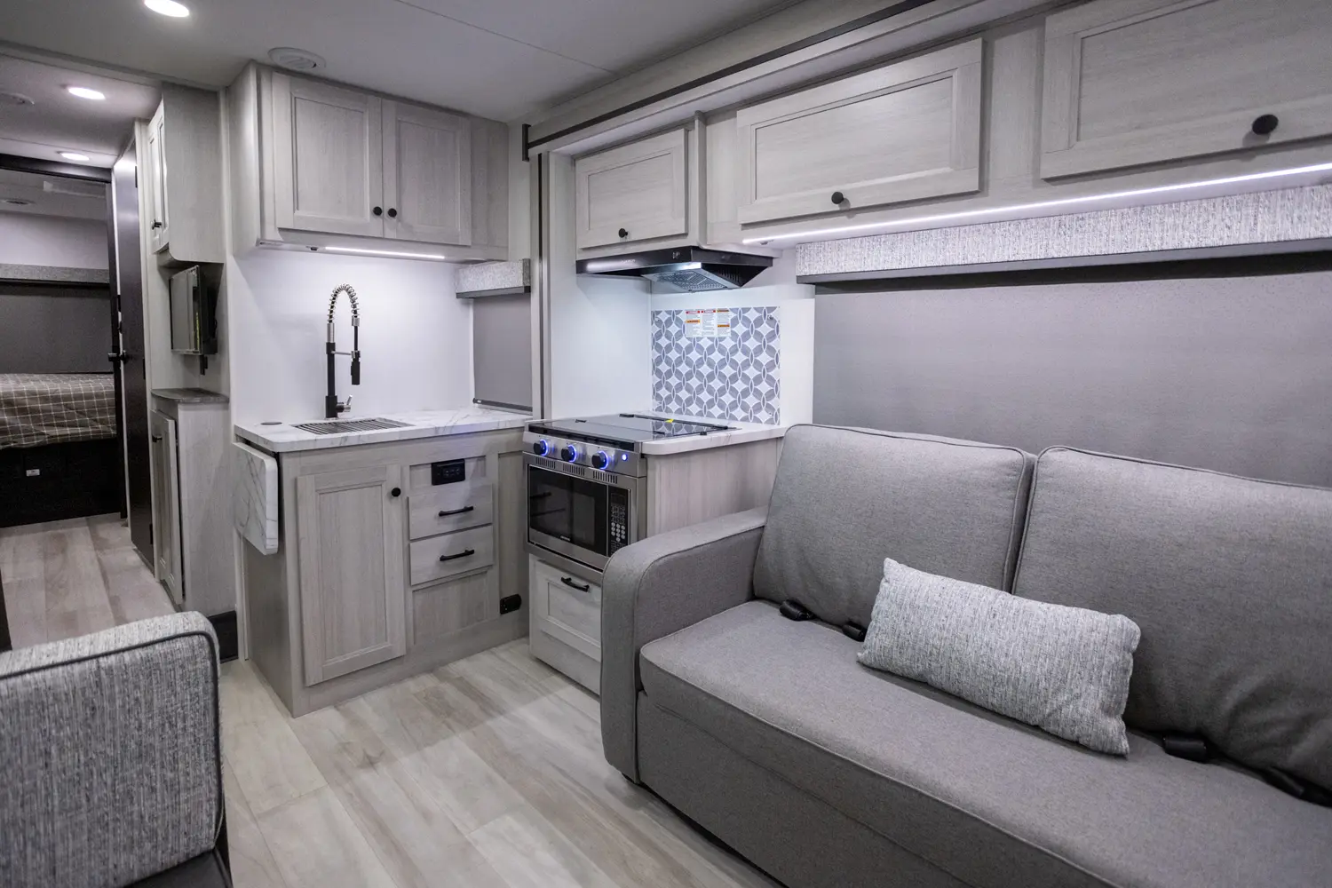 The Solera 32DSB is built on the Ford E450 chassis. This motorhome provides sleeping space for adults and kids alike, with a rear 60" x 74" queen bedroom that includes a wardrobe, plus a 28" x 72" flip-down bunk above the kid's sofa sleeper and the 60" x 80" bunk over cab. You could even transform the booth dinette and sofa into extra sleeping spaces if needed. The kitchen area is fully equipped for meals on the go, with a 10.7 cu ft 12V refrigerator, recessed 3-burner range with flush glass cover, and a 1.3 cu ft convection microwave oven. Overhead cabinets provide additional storage. The 60" x 80" bunk over cab provides more room for sleeping plus a 12V LED TV for extra entertainment!