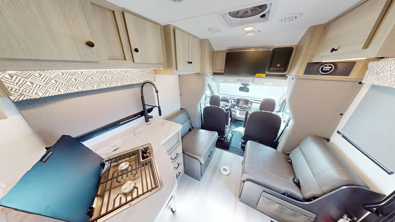 This coach will feel just like home with its double bed in the rear bedroom, a full bath, plus plenty of storage space. The kitchen provides a 12V refrigerator, cooktop, convection microwave, and lots of cabinets. The booth dinette can function as a pair of seats with the table removed, or an additional sleeping surface. This unit is built on the Ford Transit chassis.