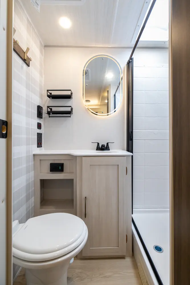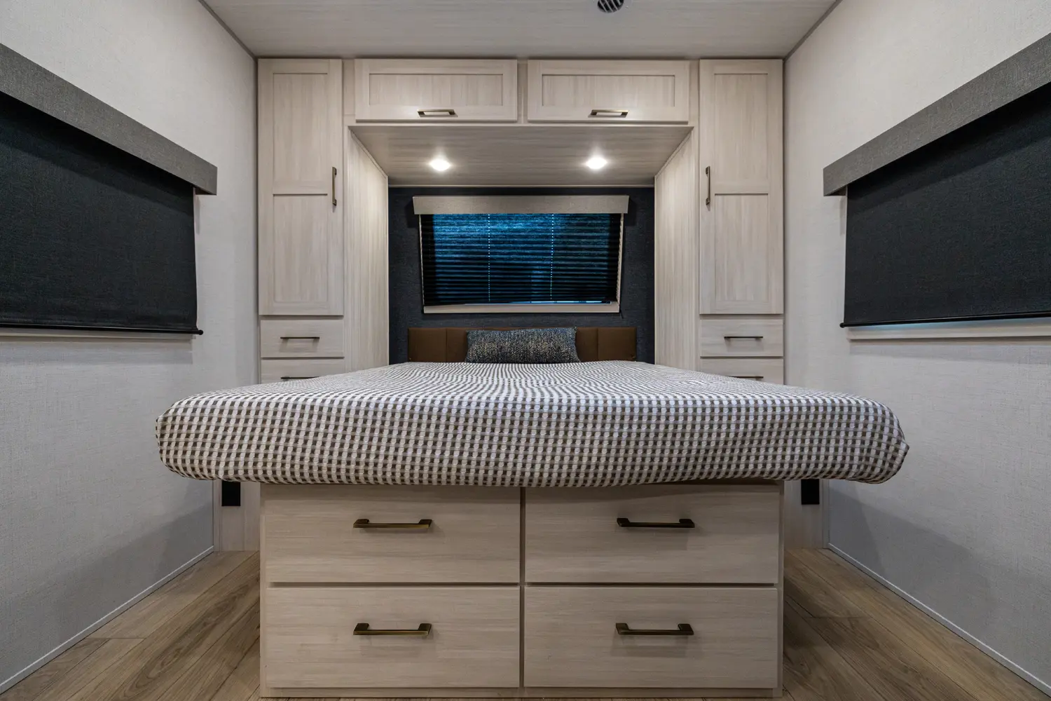 This 27' travel trailer features a front Queen bedroom with dual wardrobes and overhead storage. The kitchen includes a 10 cu. ft. 12V refrigerator and stovetop. Living space includes a sofa and a breakfast bar with two stools. The rear bathroom offers a shower, toilet, and sink. Exterior amenities include an 18' power awning with LED lights and a pass-through storage compartment.