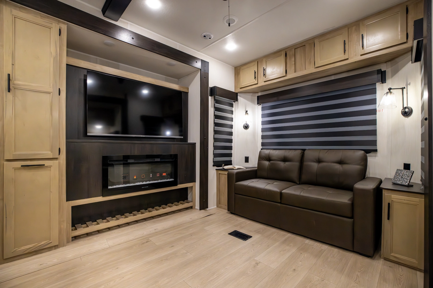 • Cherokee Black Label Timberwolf (Deep Tinted Frameless Automotive Glass Windows, High Gloss Gel Coat Exterior Sidewalls, Multicolor Reading Lights, Pillowtop Mattress Upgrade, Thermo Foil Arctic Insulation, Wall Controlled Power Shades for Living Room and Kitchen)