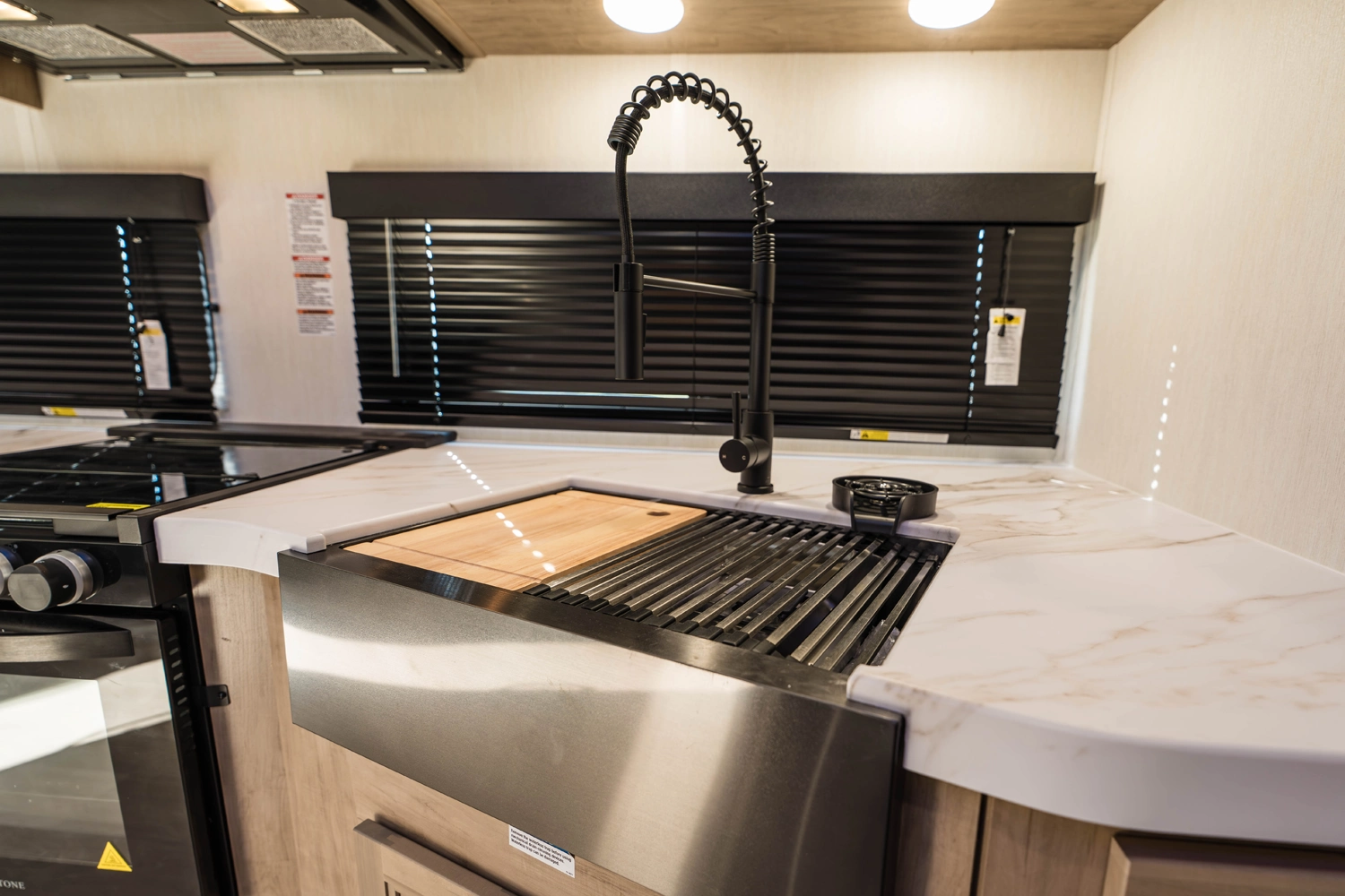 • Farm Sink with Cutting Board, Drying Rack, Strainer and Cup Washer