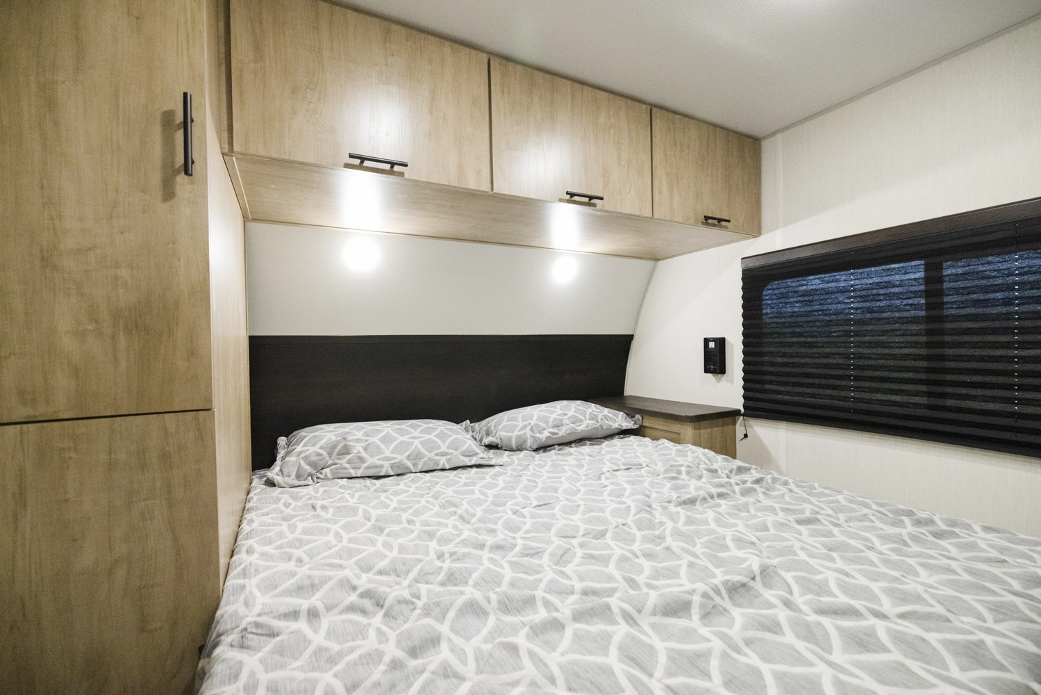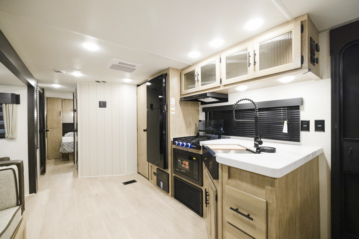 • Cherokee Black Label Wolf Den (Deep Tinted Frameless Automotive Glass Windows, High Gloss Gel Coat Exterior Sidewalls, Multicolor Reading Lights, Pillowtop Mattress Upgrade, Solid Surface Countertops, Thermo Foil Arctic Insulation)